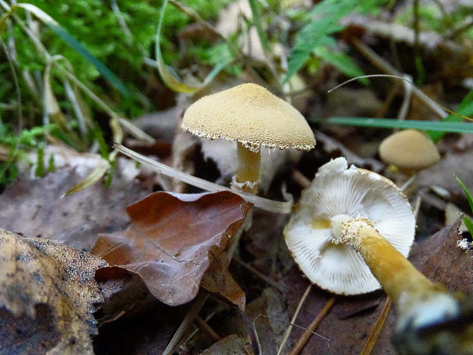Die Pilzchen sind relativ klein, sieht man im Vergleich zum Birkenblatt. Der Stiel scheint schon beschuppt zu sein, aber sehr flüchtig, und darunter nach Berühren deutlich gelb. Direkt unter dem Ring sind sie schon wollig, darüber dann deutlich abgesetzt bestenfalls sehr feinschuppig. Der Hut ist beige, sehr feinschuppig besetzt, mit deutlich hängendem weißen Velum am Rand. Er hat keine deutlich abgesetzt Mitte wie bei vielen Schirmlingen, aber irgendwie denke ich schon dass ich hier richtig bin, insbesondere auch wg. der weißen Lamellen. Ich habe mir auch die Mehl- und Stachelschirmlinge angeschaut, aber ohne echtes Ergebnis.