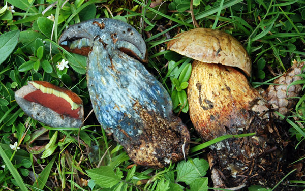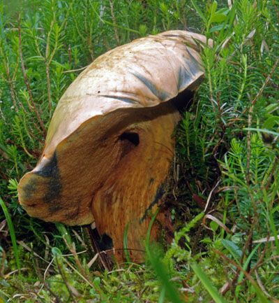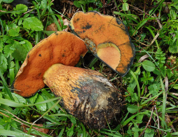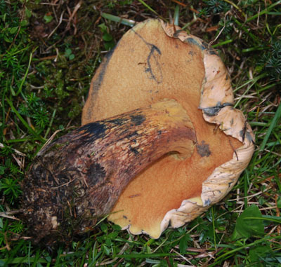 Ich bin diesem Roehrling unter Fichten im Bergwald begegnet. Erinnert mich an den Schusterpilz (Boletus erytropus)), das Fleisch blaeute sehr schnell und stark, aber die Kappe scheint viel zu blass - eher Richtung Satanspilz B. satanus- und blaeute unter Graesern. Der Stiel wurde schnell schwaerzlich.
