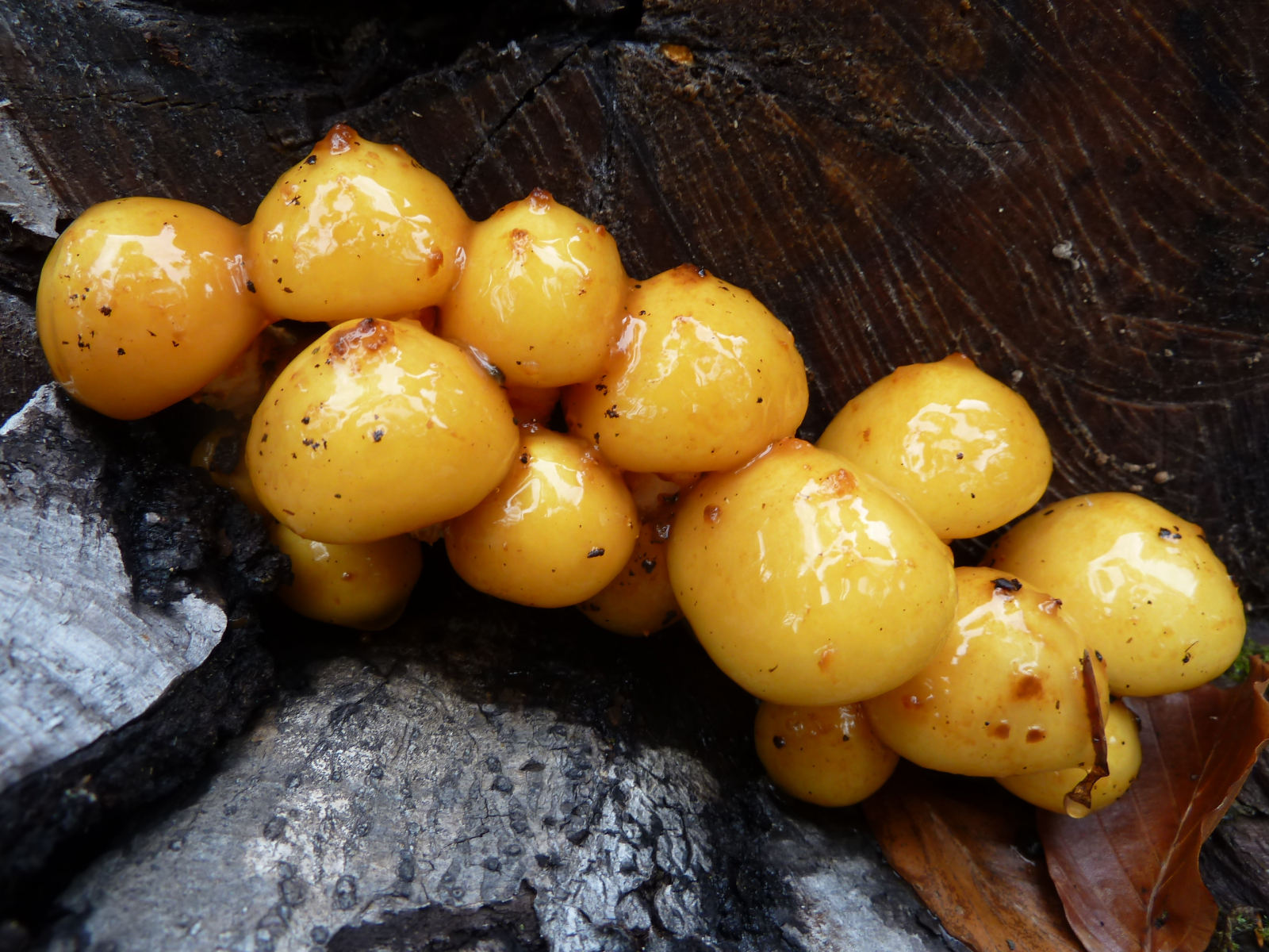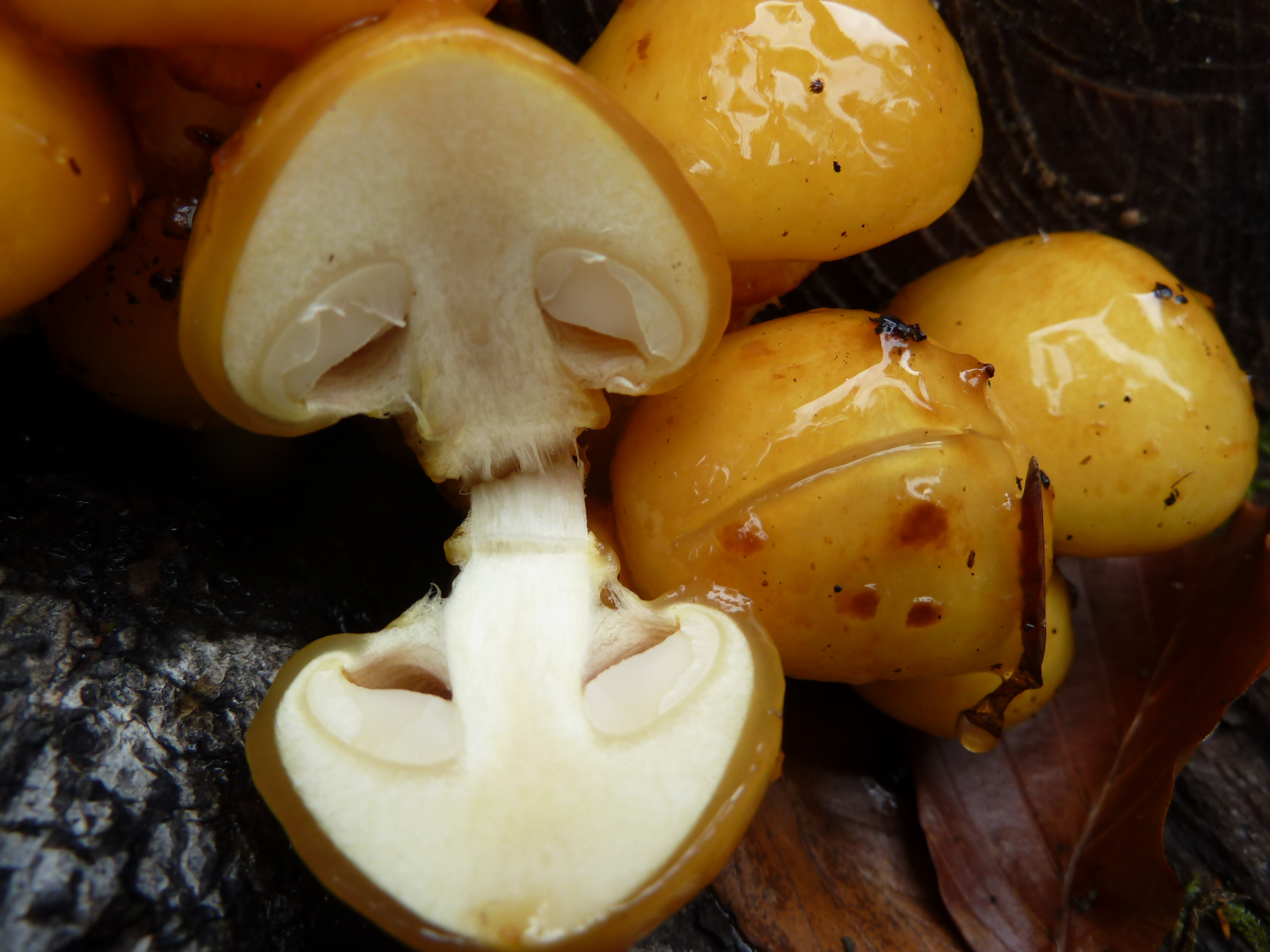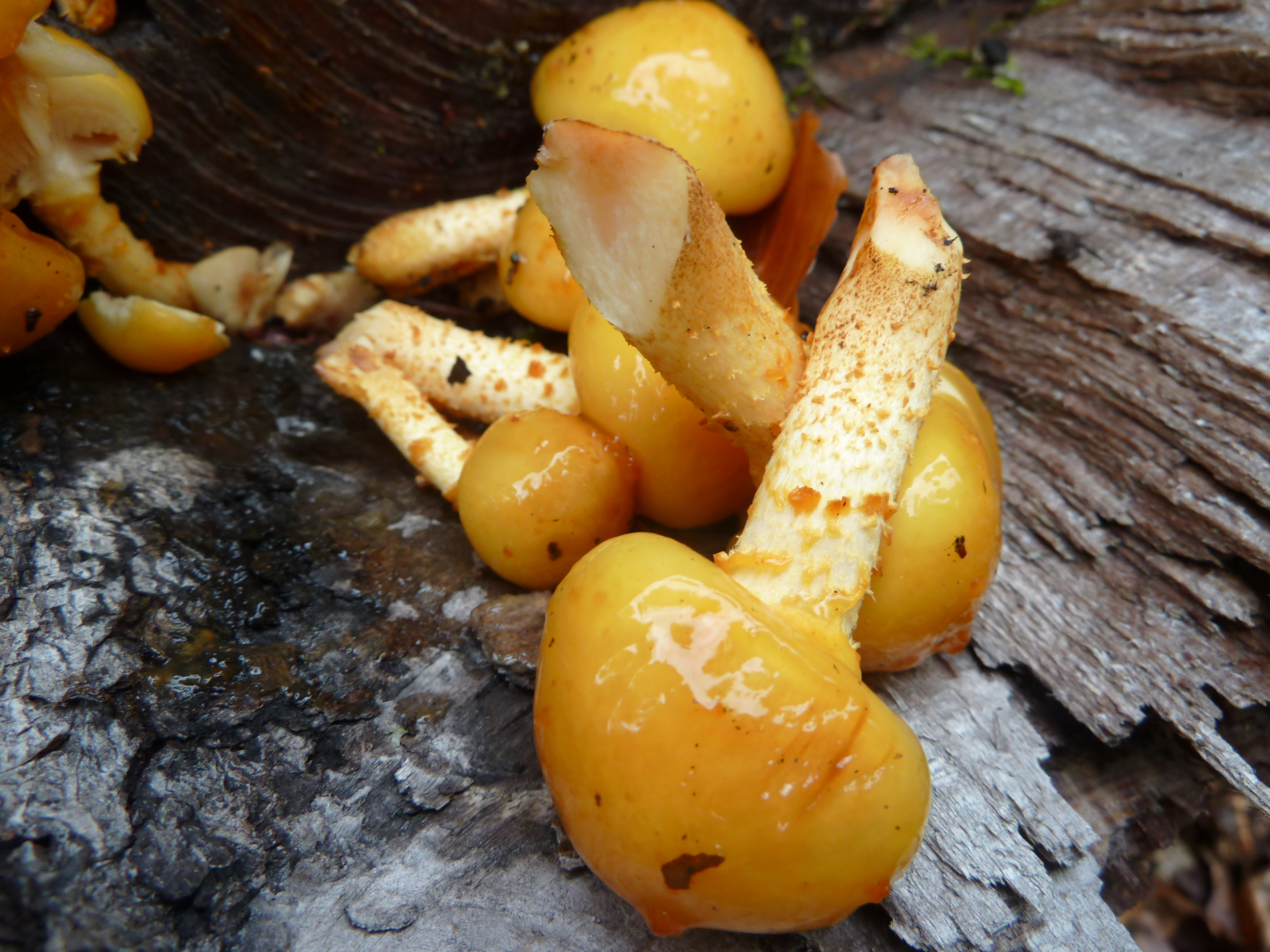 Diese goldgelben Exemplare mit sehr schleimiger Huthaut habe ich auf einem Buchenholzstumpf gefunden. Kann es sein, dass die Schuppen vom Regen abgewaschen worden sind oder ist das kein Goldfell-Schüppling?