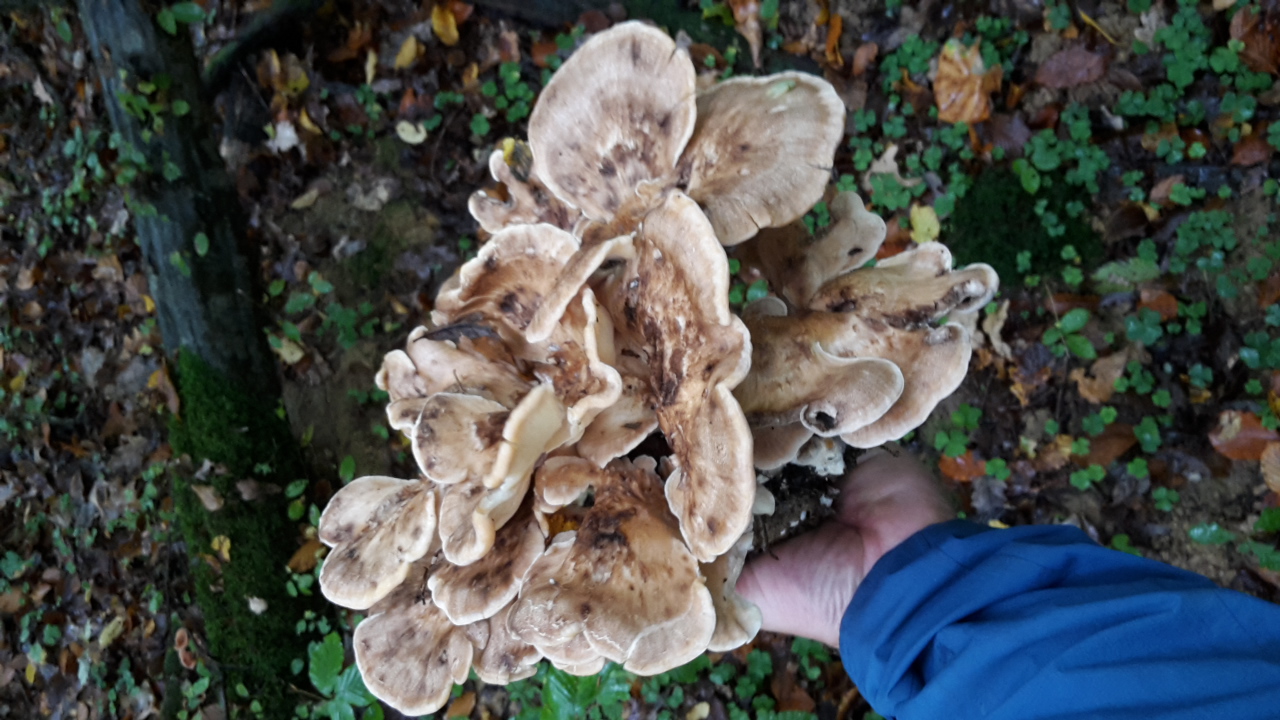 Meine amteurhafte Vermutung ging im ersten Moment in Richtung Stielporlinge, allerdings kamen mir seine Hüte für einen Eichhasen zu groß und ledrig vor..