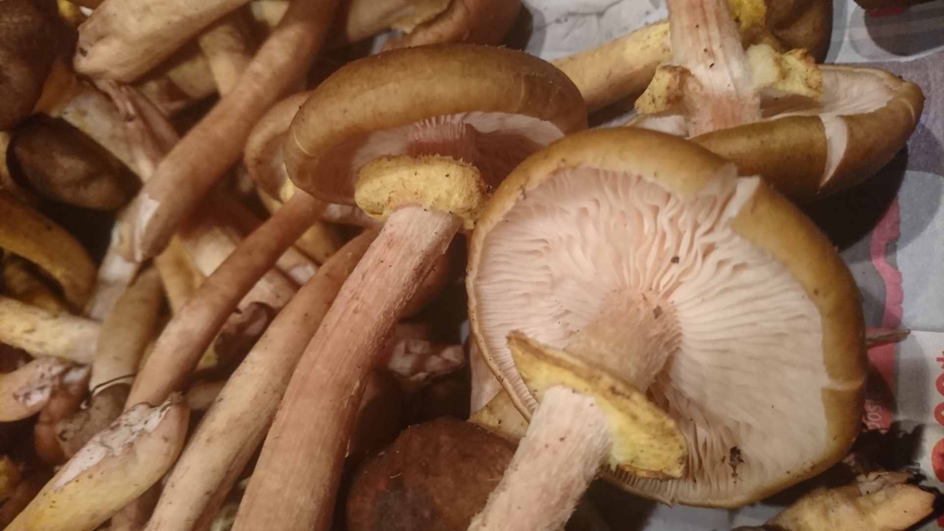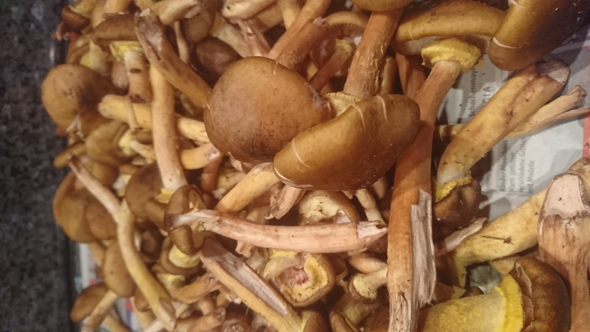 im Garten gefunden, könnte Armillaria mellea passen. Die Hüte finde ich etwas dunkel - sollten max. olivfarben bis dunkel zur Hutmitte sein. Vielleicht ist auch der gelbschuppige (Armillaria gallica) ?