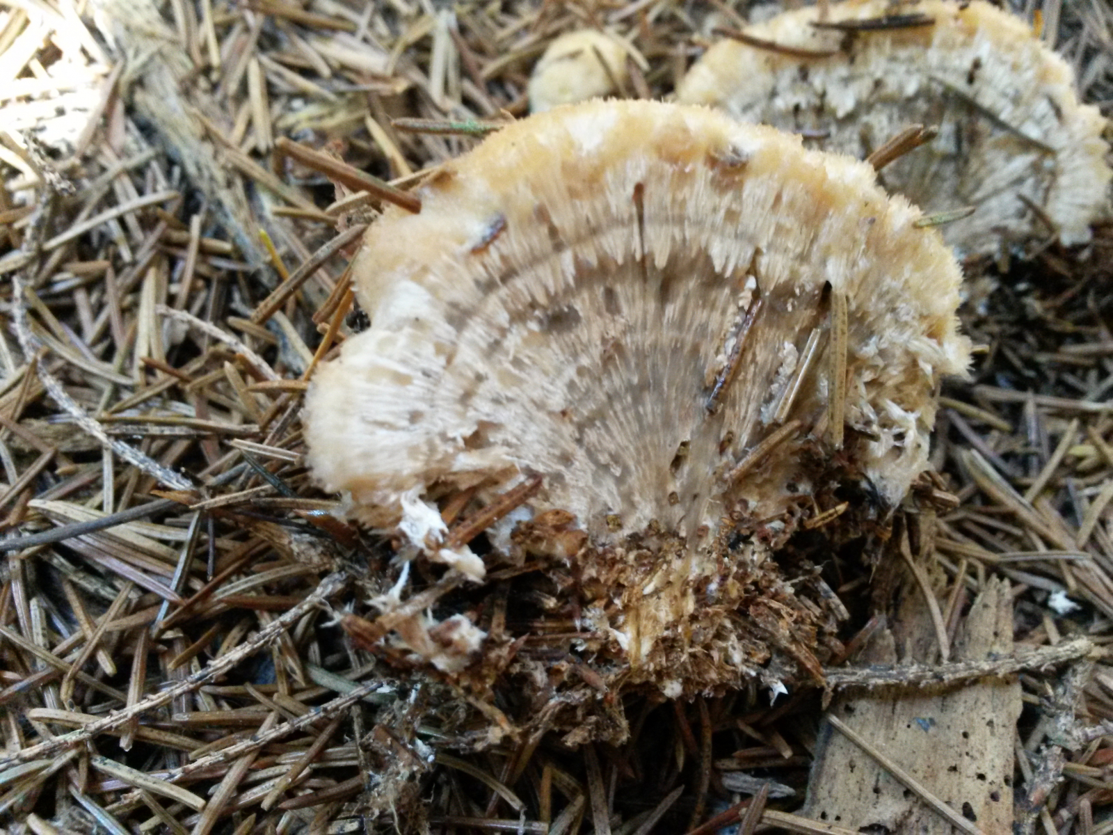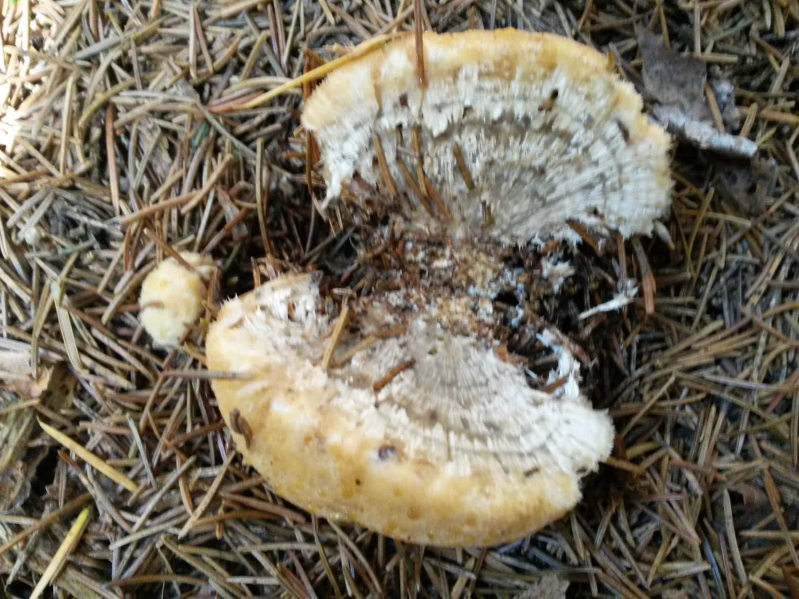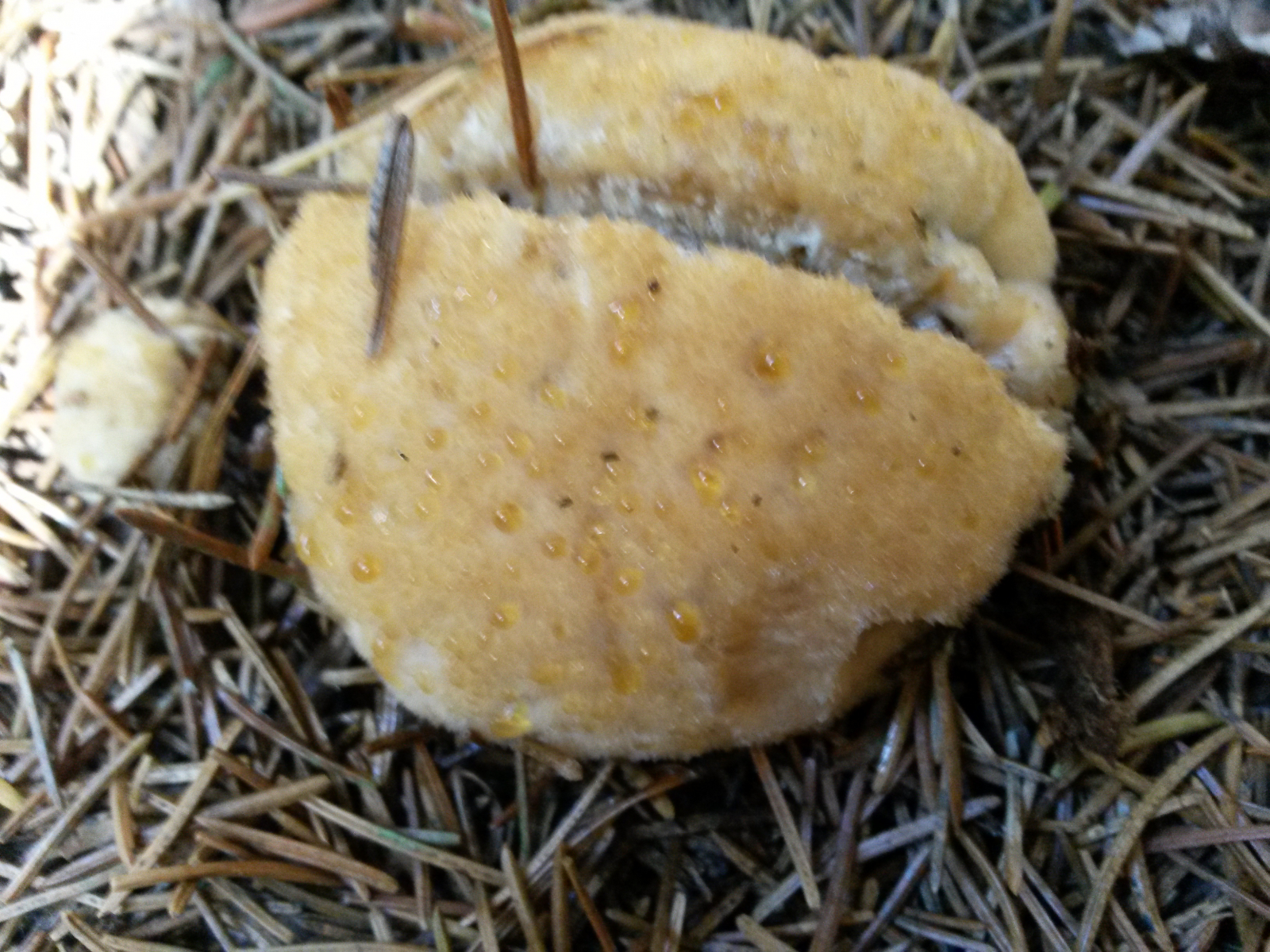 Durchmesser ca. 10cm. Oberfläche gelblich, zottig mit gelben Guttationstropfen. Rund, ohne Stiel oder Hut. Durchgeschnitten innen weiss mit deutlichen Wachstumszonen. Geruch angenehm sehr würzig pilzig.