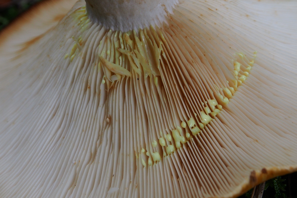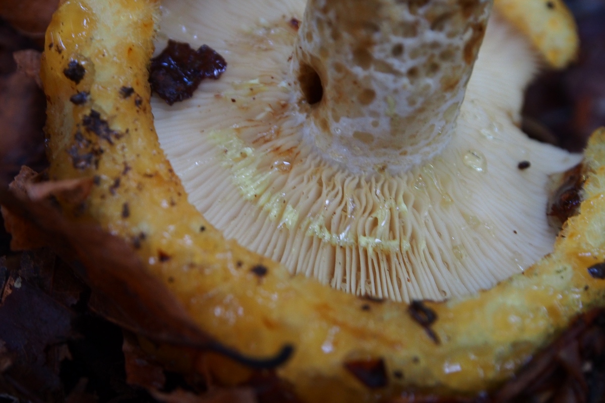 [font="Verdana"]Den ersten Fruchtkörper fand ich am Wegrand, älter, er sah mir auf den ersten Blick nicht sooo spannend aus (Hut ockerfarben, in der Mitte trichterförmig, trocken), daher hab ich ihn nur von unten fotografiert, um die Milchfarbe zu kontrollieren: Milch gelb –“ ich tippte ohne viel Grübeln auf den Goldflüssigen Milchling. [/font]