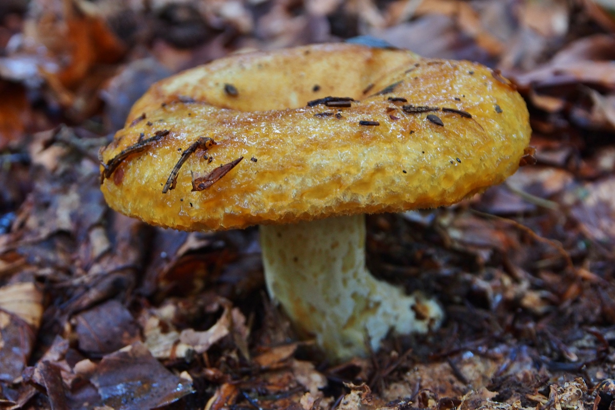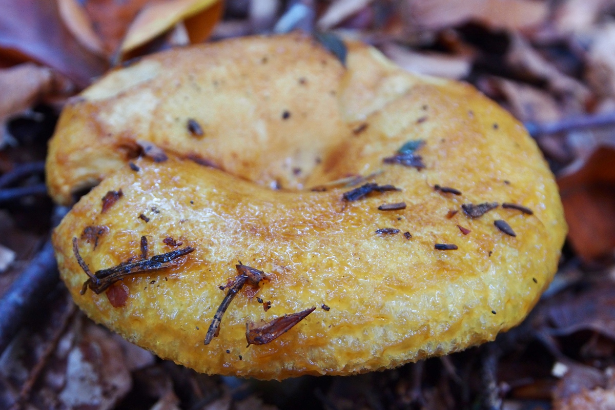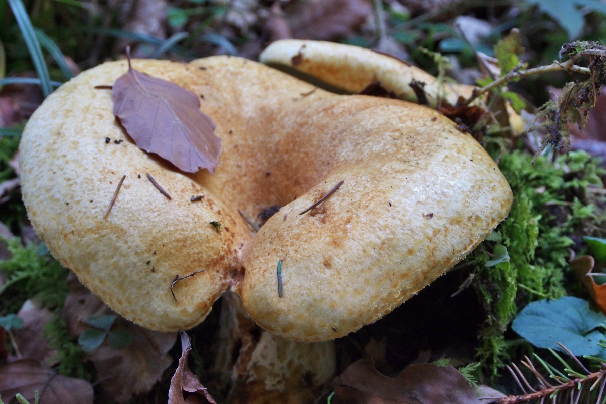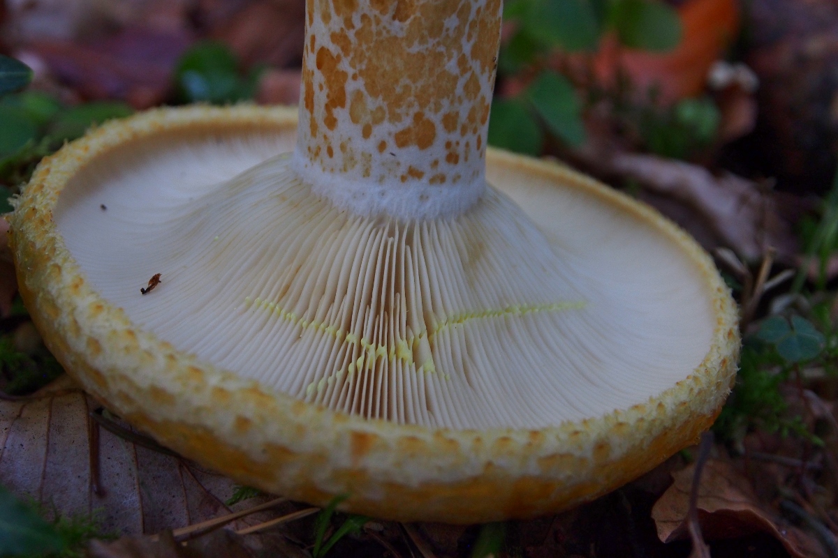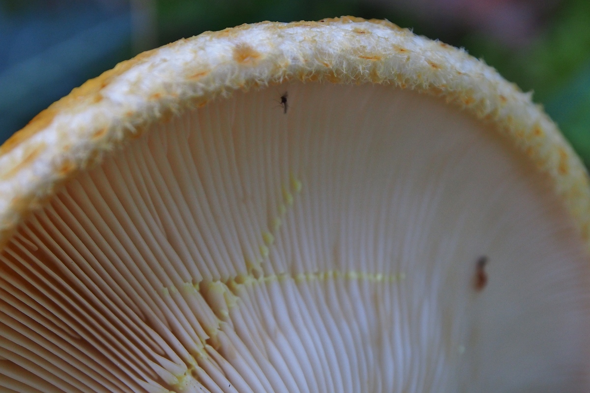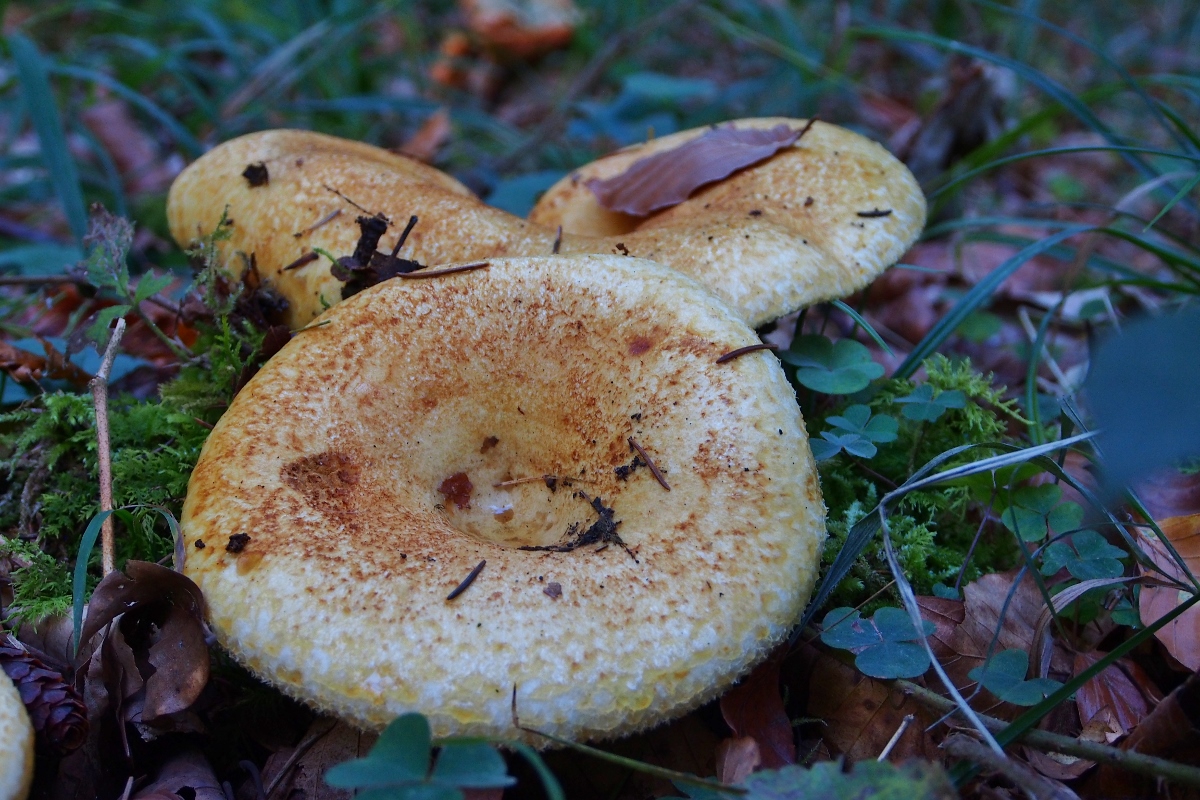 [font="Verdana"]Den ersten Fruchtkörper fand ich am Wegrand, älter, er sah mir auf den ersten Blick nicht sooo spannend aus (Hut ockerfarben, in der Mitte trichterförmig, trocken), daher hab ich ihn nur von unten fotografiert, um die Milchfarbe zu kontrollieren: Milch gelb –“ ich tippte ohne viel Grübeln auf den Goldflüssigen Milchling. [/font]