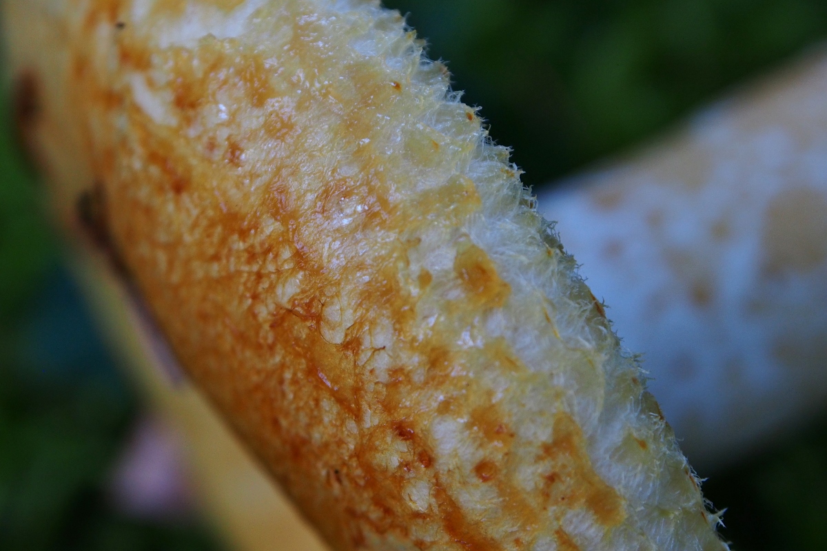 [font="Symbol"] ·[font="Times New Roman"] [/font][/font][font="Verdana"]Hut fast schleimig, richtig glasig, aber nicht wie bei den Schleimköpfen über die ganze Fläche –“ siehe Fotos, ich kann das schlecht beschreiben, am Rand zottig. [/font]