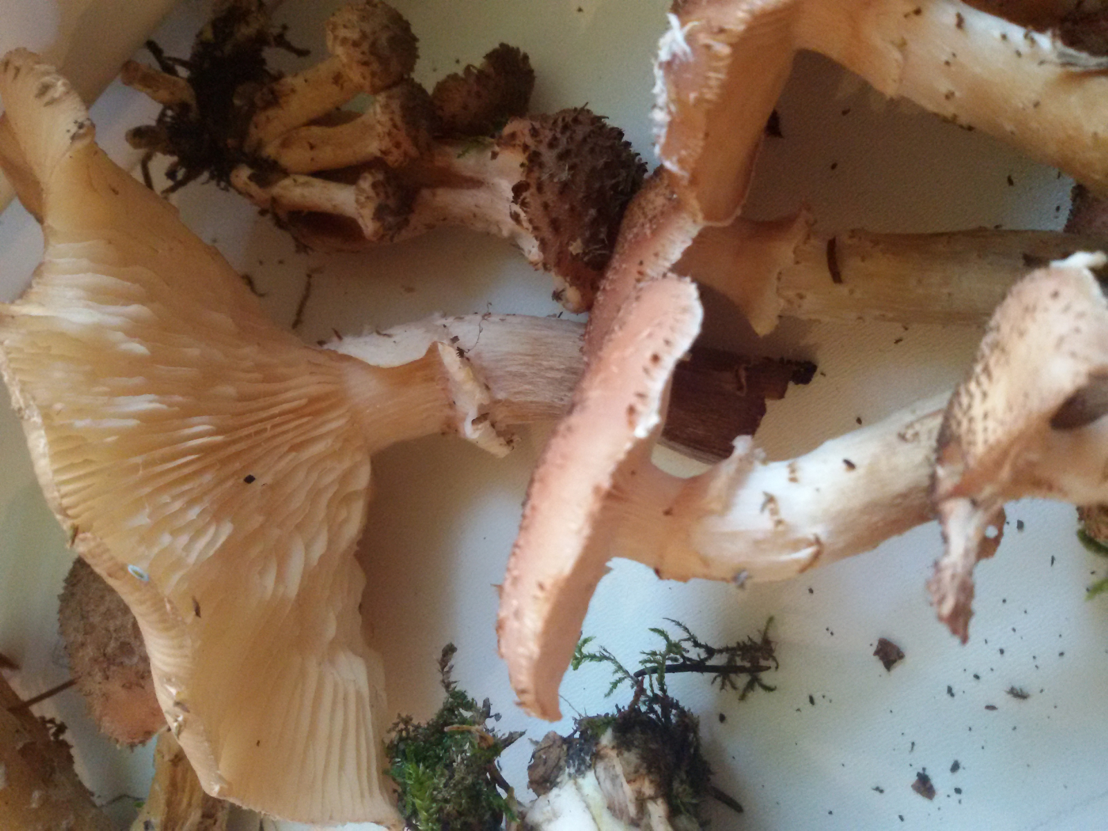 Der Hallimasch hat weißes Sporenpulver, das sich oft auf den unteren Hüten absetzt.