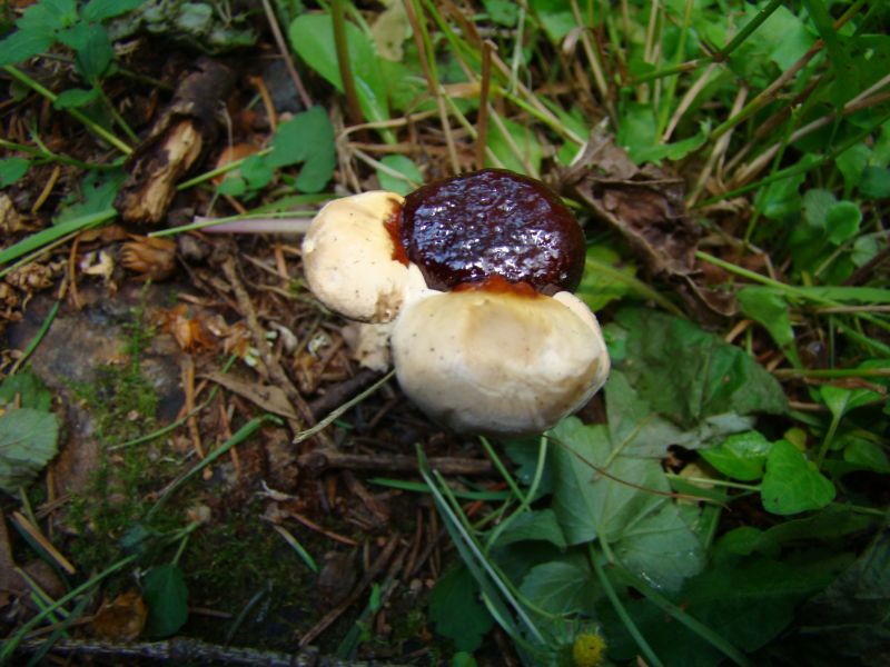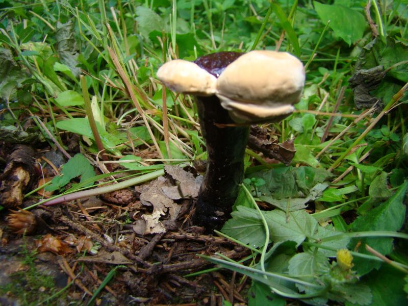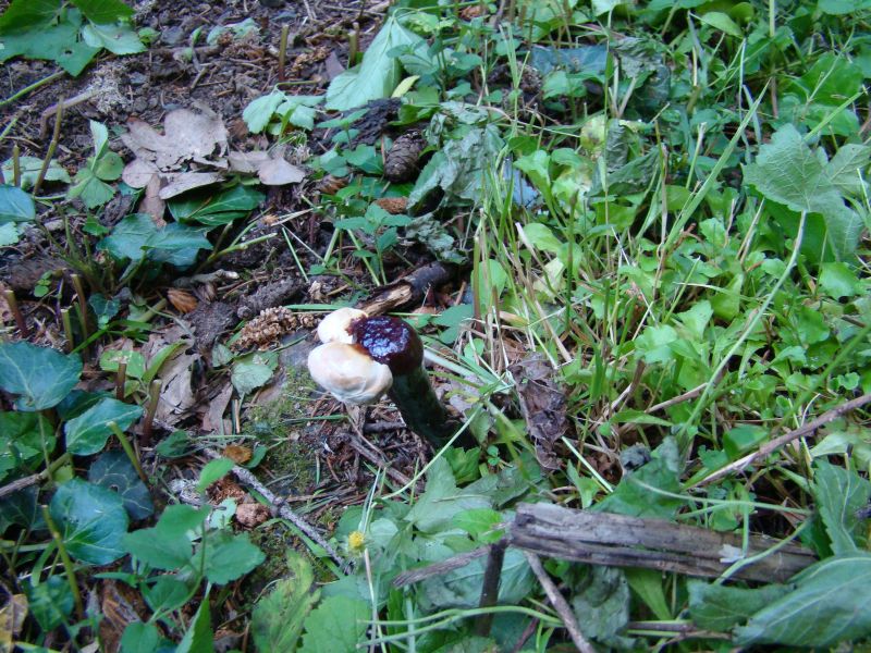 Zum Einstand habe ich gleich einen noch nie gesehenen Pilzkörper fotografiert und hoffe auf tatkräftige Hilfe bei der Bestimmung. Ich habe ihn heute auf einem Hausgrundstück mitten in unserem Ort gefunde. Das Haus ist mit Hecken und einigen sehr alten Nadelbäumen umgeben. (Fichten u. Blautannen). Aber dennoch hell genug für Gräser. Der Pilzkörper hat eine ungefähre Höhe von 12 cm. Geruch war keiner feststellbar. Der dunkel gefärbte Teil des Pilzes erscheint schleimig-glänzend, ist aber relativ trocken. Zu anderen Merkmalen kannich keine Angaben machen, sonst hätte ich Beschädigungen des Pilzkörpers in Kauf nehmen müssen.