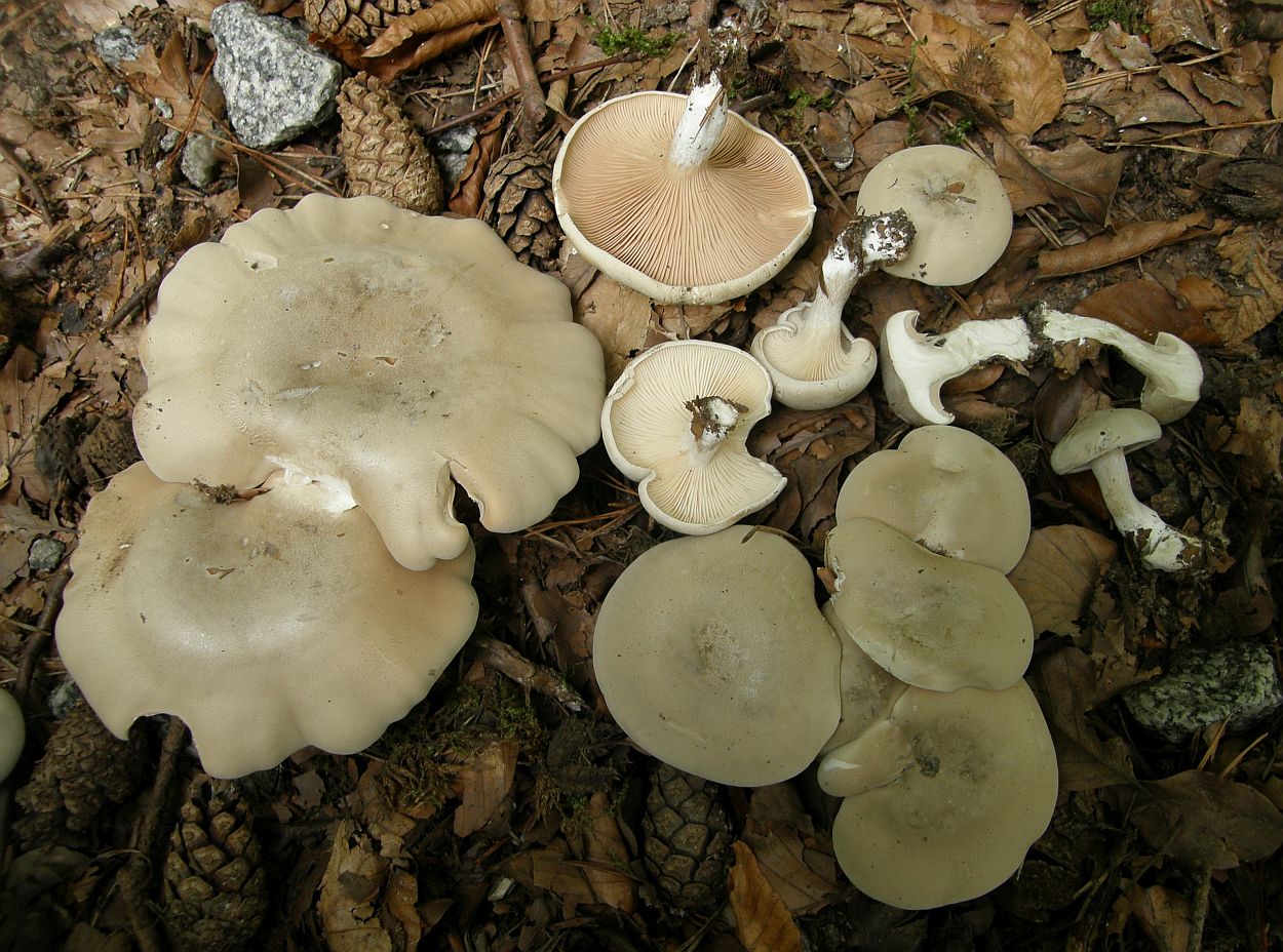 Das für mich neue Gebiet ist auch kalkhaltig, aber scheinbar feuchter (Wasser fließt nicht so schnell an Hängen ab) - und scheint oberflächlich an manchen Ecken versauerter zu sein (Fliegenpilze, zwei Stellen) - an anderen Stellen gibt es aber wiederum typische "kalkholde" Pilze. Und in diesem Gebiet (mit Krausen Kraterellen und Totentrompeten), da wuchsen auch die Mehlräslinge mit den graueren Hüten, die mir auch relativ fleischig erschienen.
