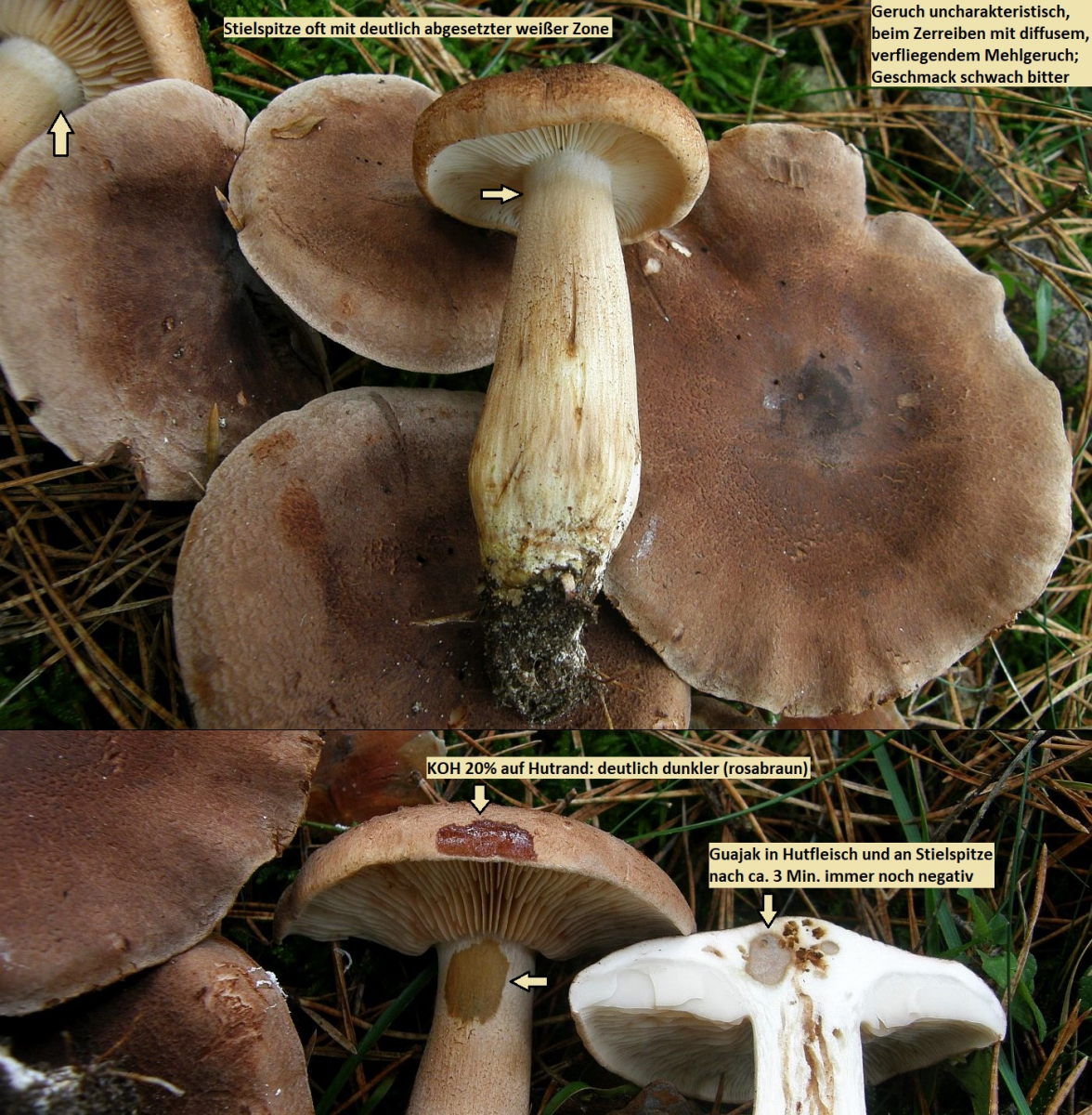 Jetzt ist es ja so, daß es in der Gattung Tricholoma noch ein oder zwei weitere Arten gibt, außer den braunhütigen mit mehlgurkigem Geruch bei Kiefer und / oder Pappel.