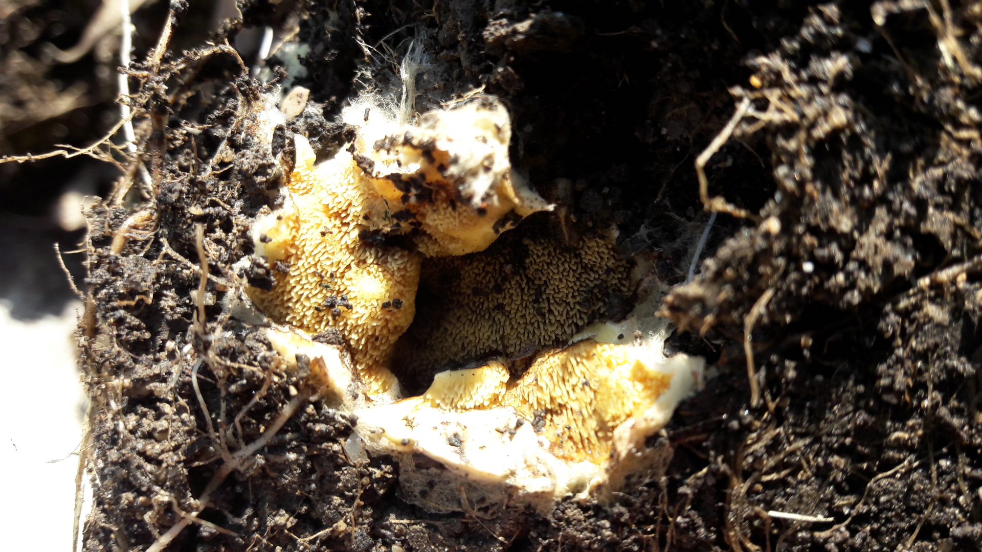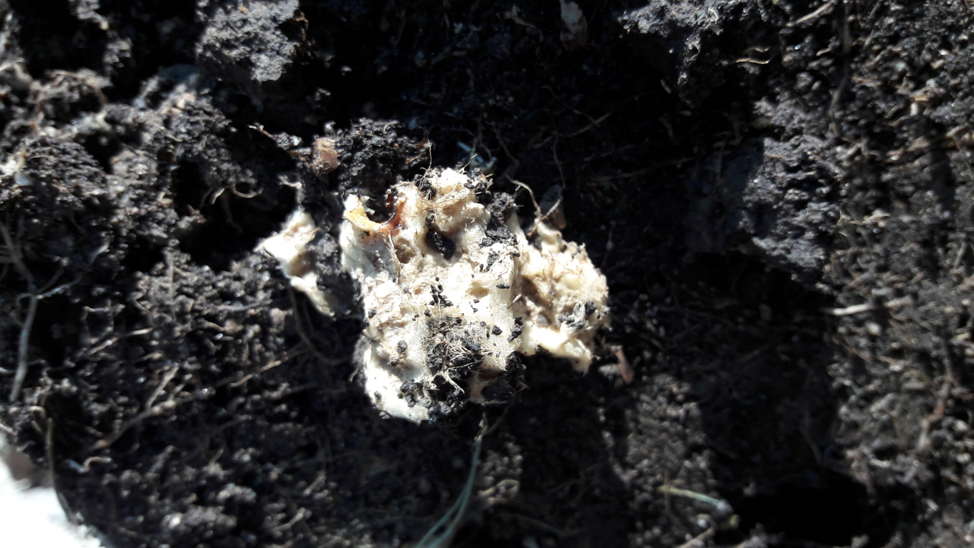 keine offensichtlichen mycelfäden ausbildend/weißliche Oberseite/kann auch noch von der in den kübel eingelegten Zeitung stammen