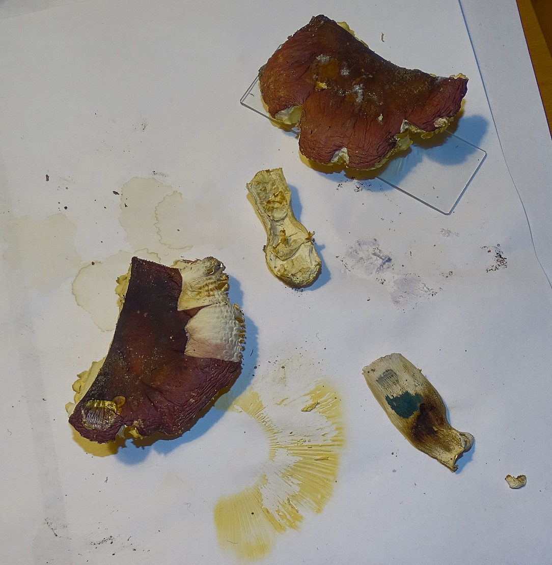 Hut schmutzig rotviolett, Huthaut 1/3 bis 1/2 abziehbar, Hut darunter rosa angehaucht, Stiel hohl markig ausgefüllt, Chemie passt soweit wie getestet laut Pilze der Schweiz gut zu cyanoxantha: Fe2So4 +/- neutral, Guajak blaugrün, Phenol dunkelbraun - auf den Schreibtischbildern gut zu sehen. Aber eben dort auch gut zu sehen die Sporenfarbe - zumindest hellocker, keinesfalls weiß. Achso, natürlich das wichtigste, was mich erst auf Frauentäubling brachte und mich jetzt ratlos zurück lässt: die weichen biegsamen Lamellen ...