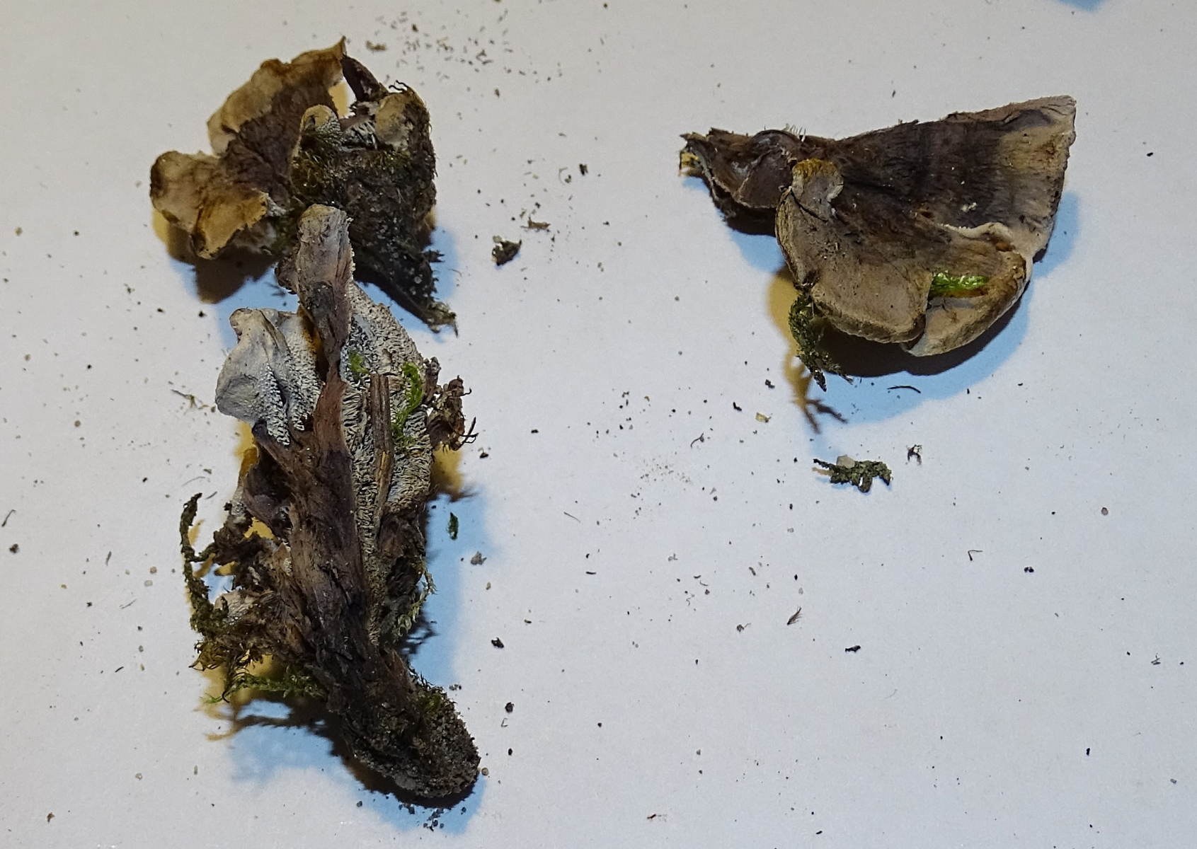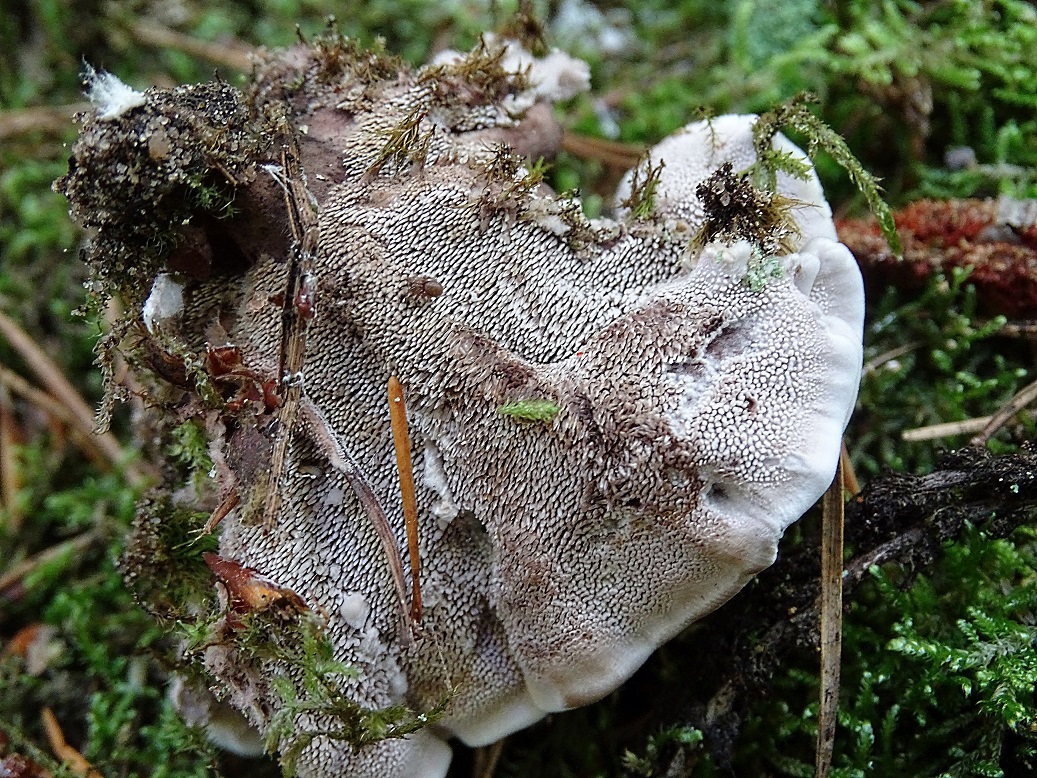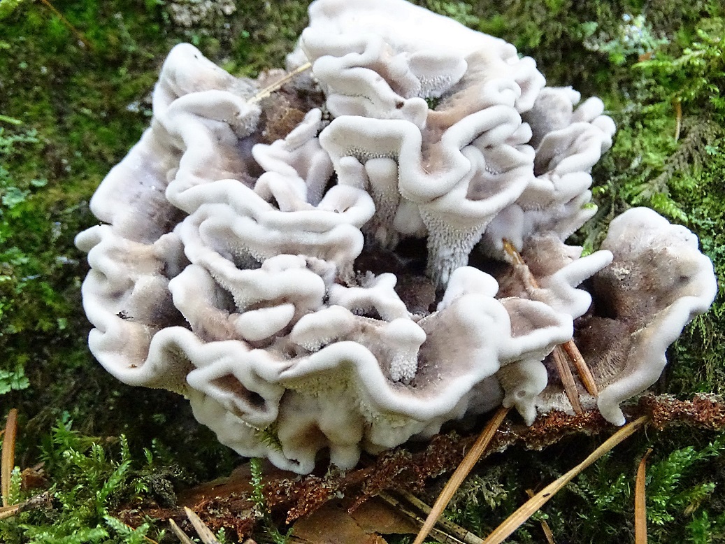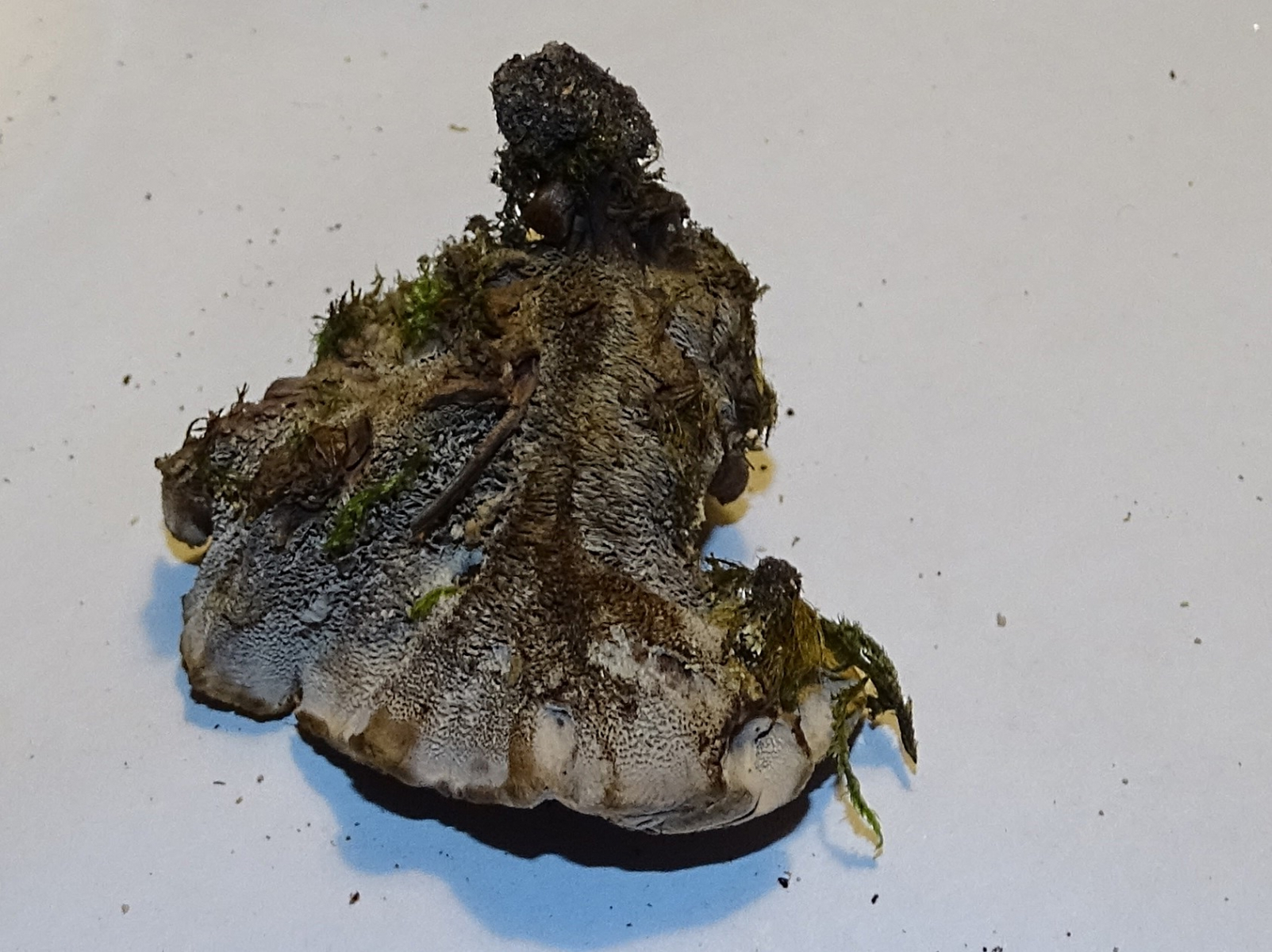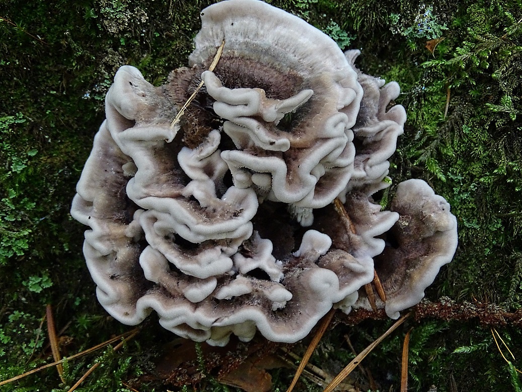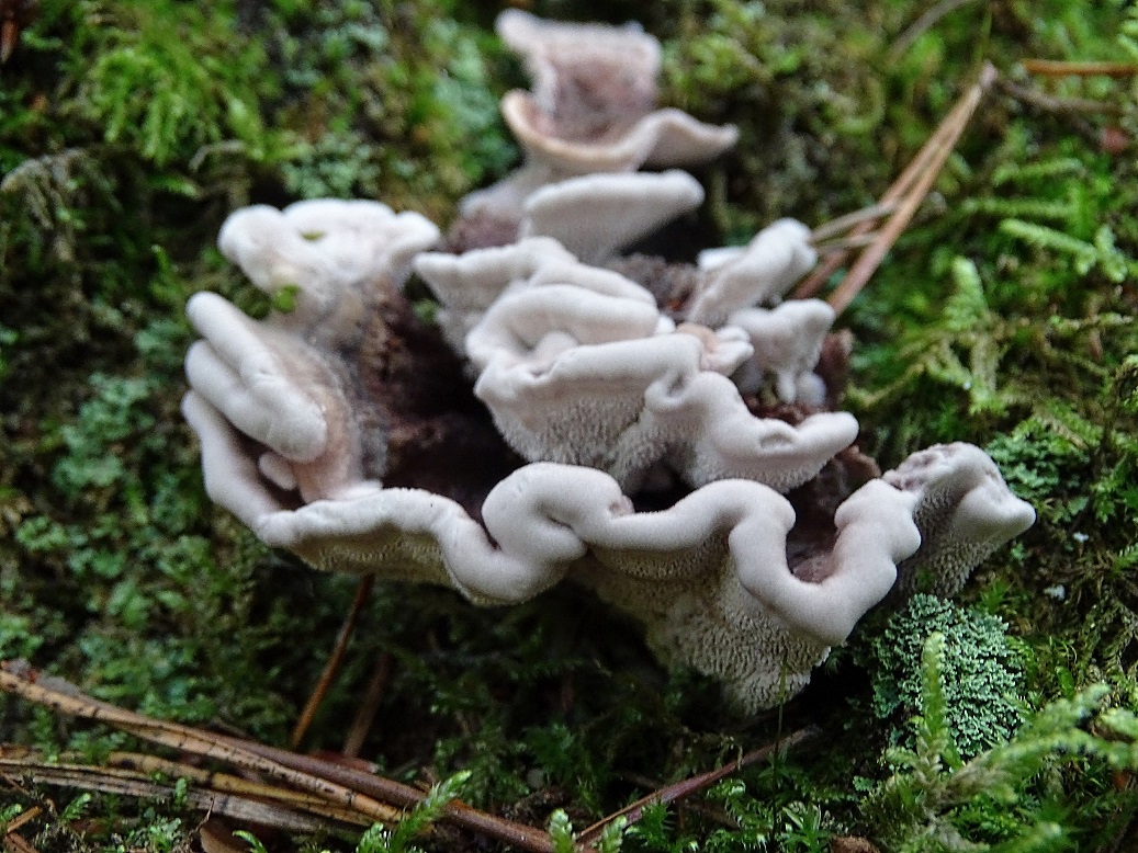 Korkstachelinge habe ich noch nie bewusst gefunden, könnte das in die Richtung gehen? Allerdings lese ich da immer "+/- in Hut und Stiel gegliedert" - das kann ich nicht wirklich entdecken. Die wachsen zwar aus einer zentralen Quelle, also nicht wie Trameten mit breiten Ansatzlinien, aber reicht das für einen "+/- Stiel"? Auffällig sind daneben die schönen weißen Zuwachskanten.
