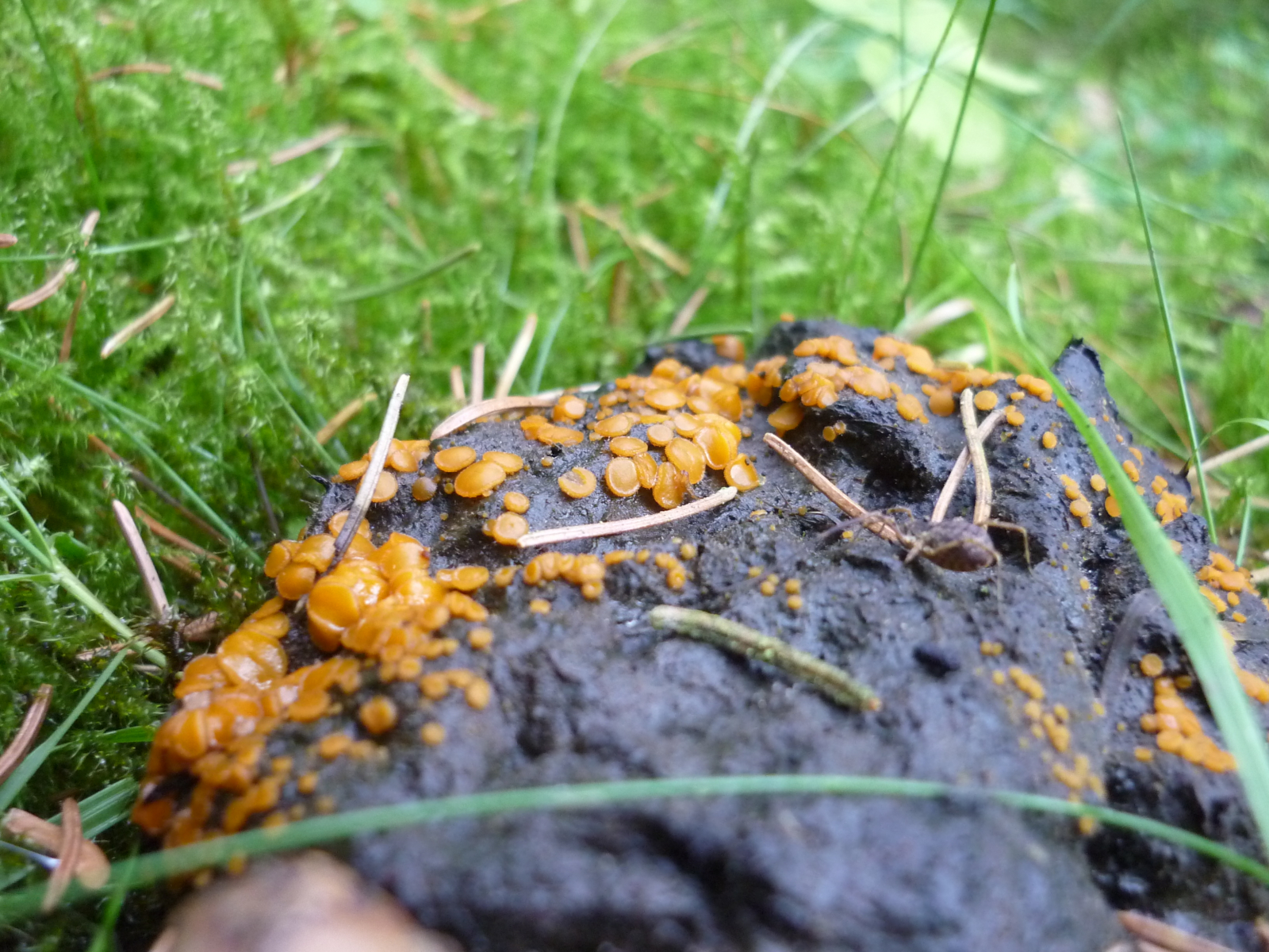 bin ganz aufgeregt. Ich habe schon wieder Perser gefunden. Normalerweise wären das wohl Zitronengelbe Holzbecherchen. Sind es aber wohl nicht, weil sie eben nicht auf Holz wuchsen sondern auf den Hinterlassenschaften eines Elchs- jedenfalls vom Umfang her muss es so was Großes wie ein Elch oder sogar Dinosaurier gewesen sein...