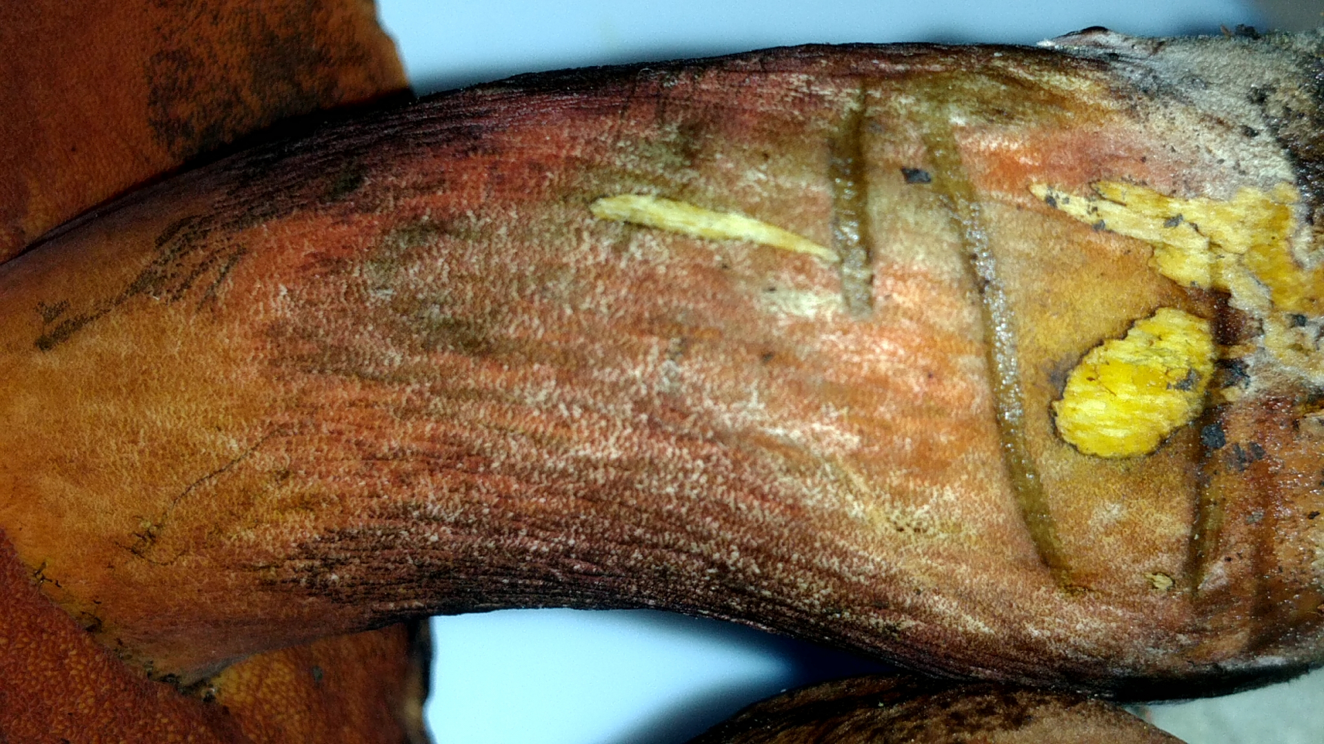 ich sehe hier einen Flockenstieligen Hexenröhrling erkennbar wie hier auch auf dem vorletzten Bild sichtbar an dem typisch rot gelb beflockten Stiel und keine Netzzeichnung ein weiteres Unterscheidungsmerkmal zwischen diesen beiden Arten wäre auch ein gelber Röhrenboden beim netzstieligen wäre dieser orange