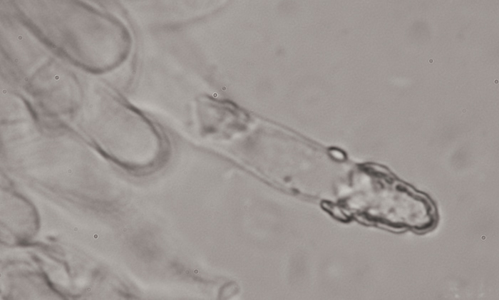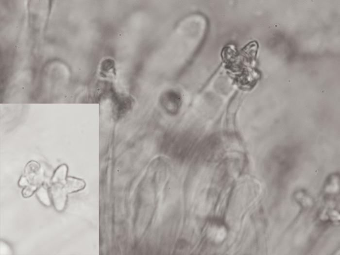 Ui, der sieht aber wunderlich aus. Solche kristallbeschopften Zystiden sind bei Physisporinus normalerweise nicht zu finden (einen Physisporinus vitreus hatte ich mal, wo es in der Trama der Röhrenmündungen vereinzelt ählniche Elemente gab, bestimmt wurde der dann letztlch von Frank Dämmrich).