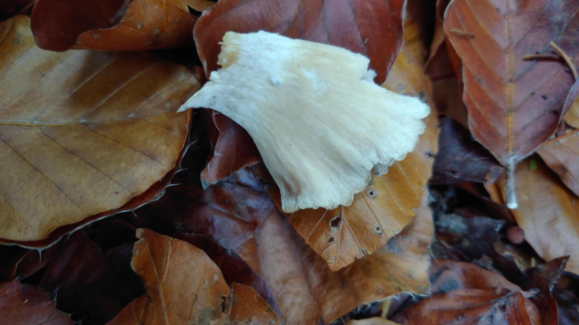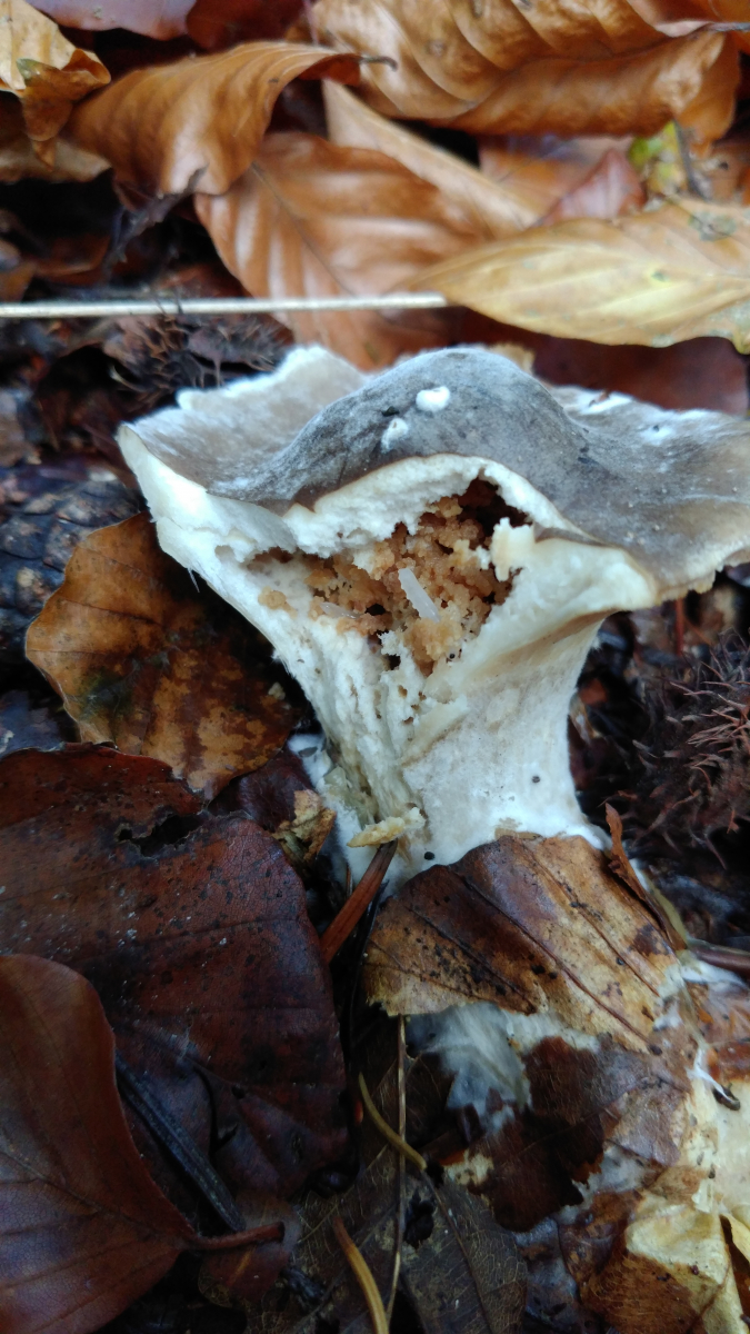 keine Sache. ich denke jetzt auch, dass es missgebildete Lamellen sind, wahrscheinlich durch eine andere Pilzart - wie es z. B. beim Steinreizker vorkommt, Pablo hat auch was verlinkt, und dass in der Folge die Kappe des L. nebularis draufgesackt ist. Ich hab so etwas noch nie gesehen.