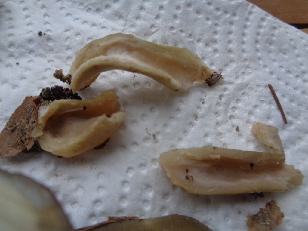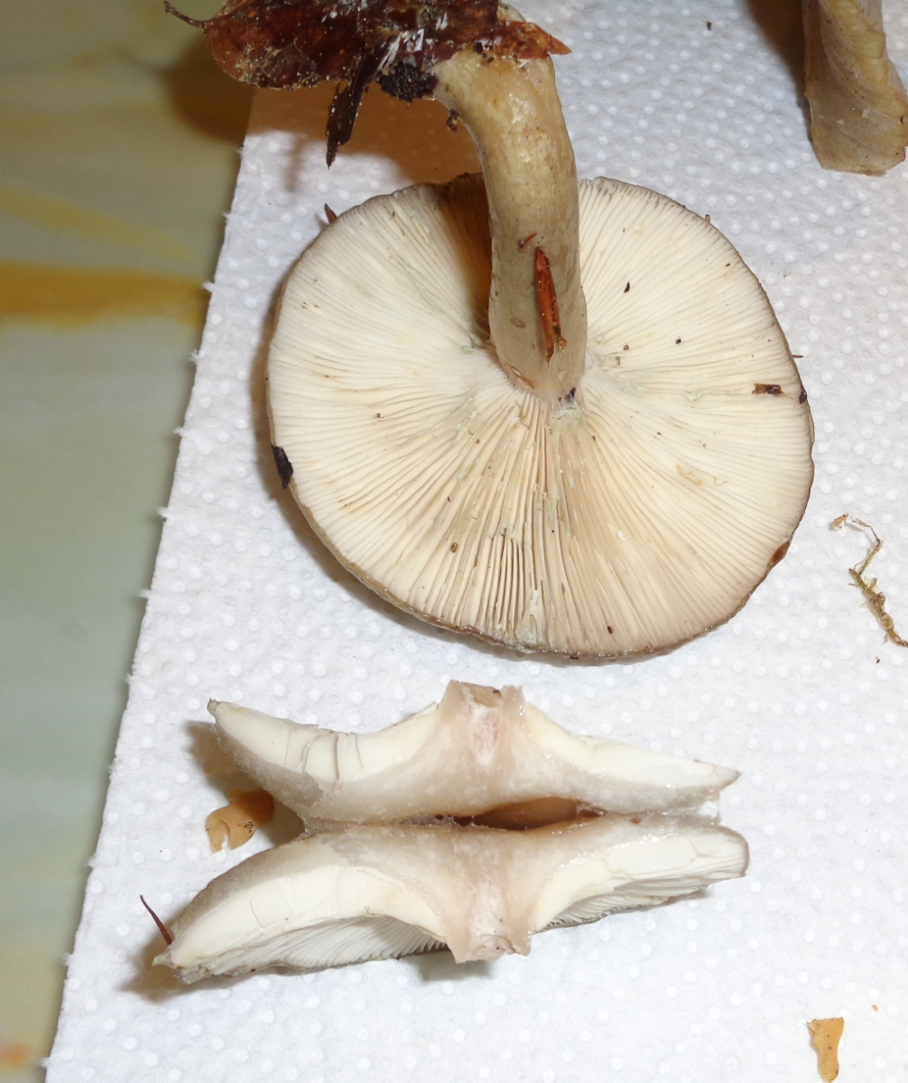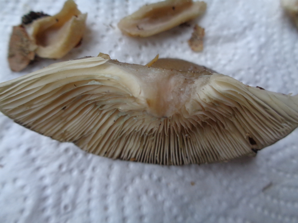 Lamellen cremefarbig, eng/dicht stehend, nicht splitternd, angeheftet, vom Fruchtkörper abschiebbar