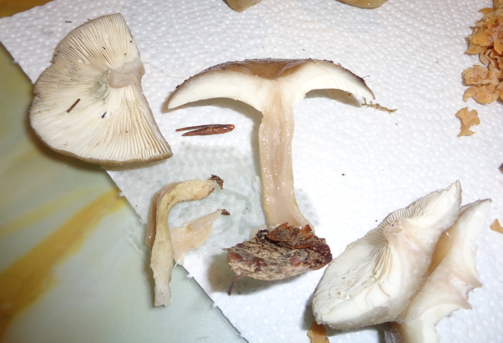 Vereinzelte Graublättrige Schwefelköpfe, Fichtenreizker, Krause Glucke, wenige Maronenröhrlinge und riesige wunderbare stark gebaute Nelbelkappen haben den weiteren Regen und niedrigeren Temperaturen getrotzt.
