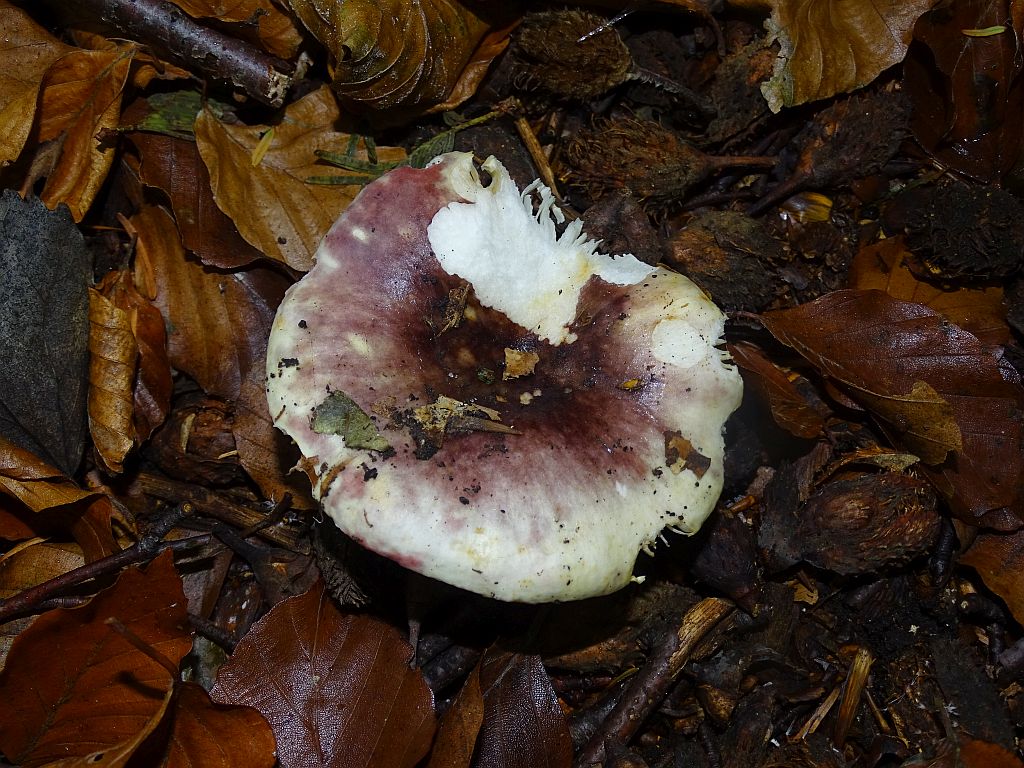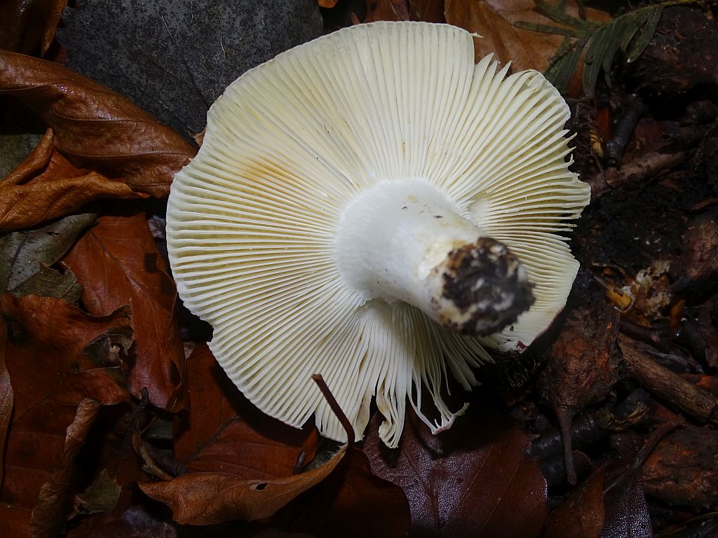 Stiel weiß, deutlich in den Hut erweitert, Basis mit rotbraunen Flecken