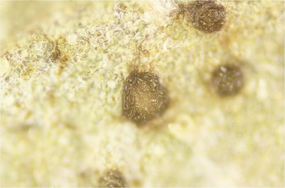 Diesen Pilz fand ich am 24.10.17 auf einem Blatt von Juglans regia (Echte Walnuss).