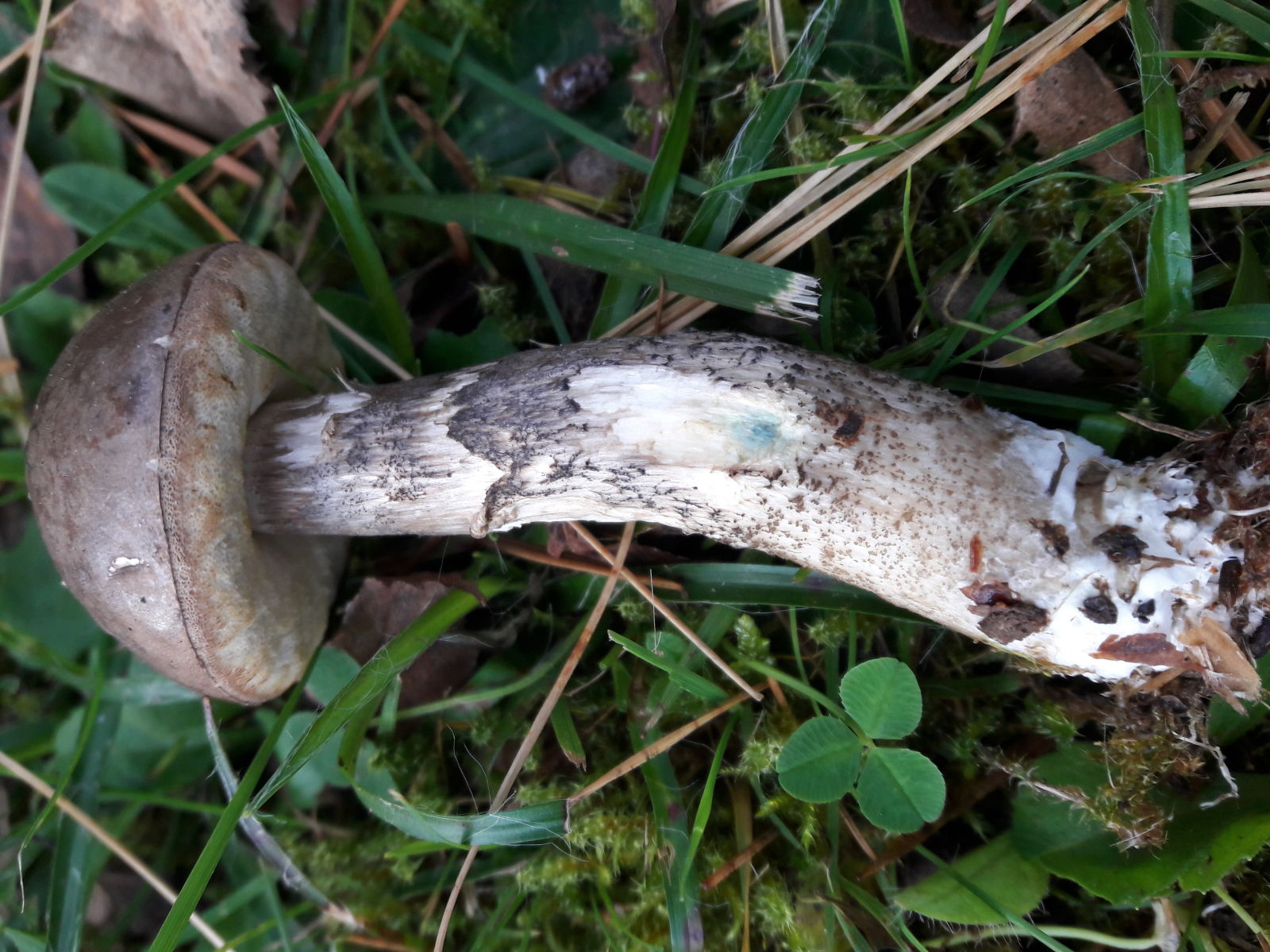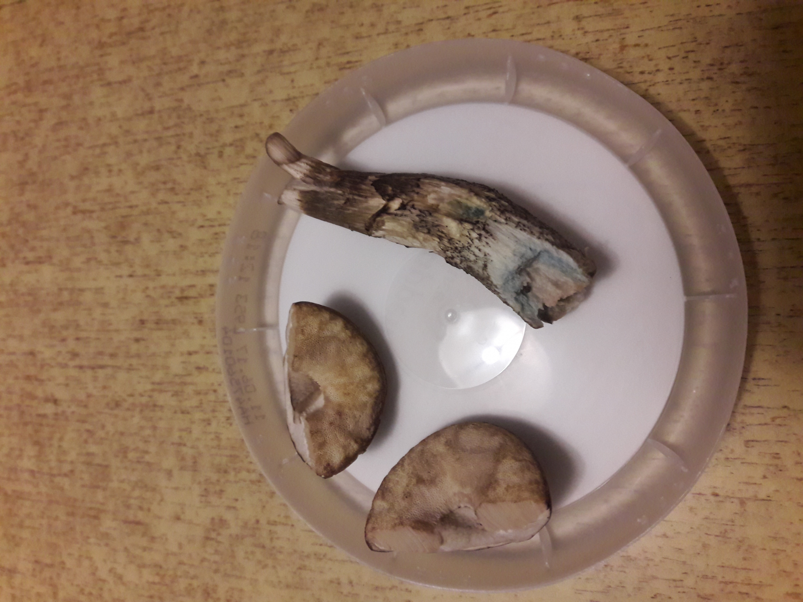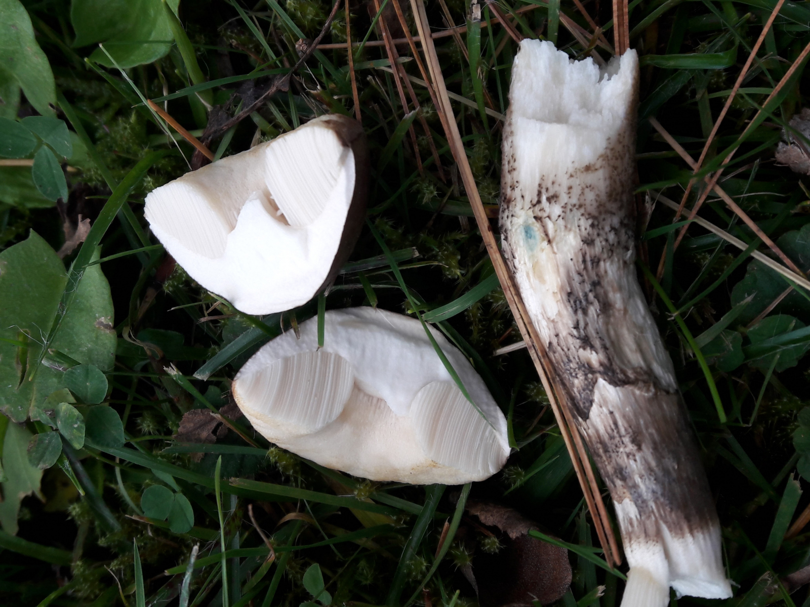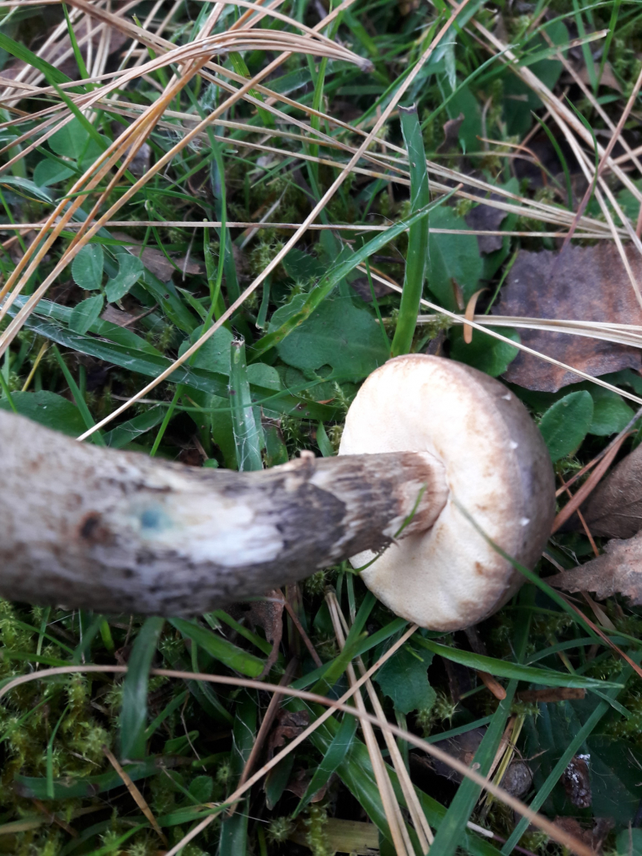 Habe erst nur den kleinen bläulichen Fleck am Stiel wahrgenommen, und hatte dann schon meinen Verdacht, dass es der Vielverfärbende sein muss. Hab nochmal am Stiel was abgeknibbelt (hatte kein Messer mit) und der Pilz verfärbte sich an der verletzten Stelle erst rosa und später blau.