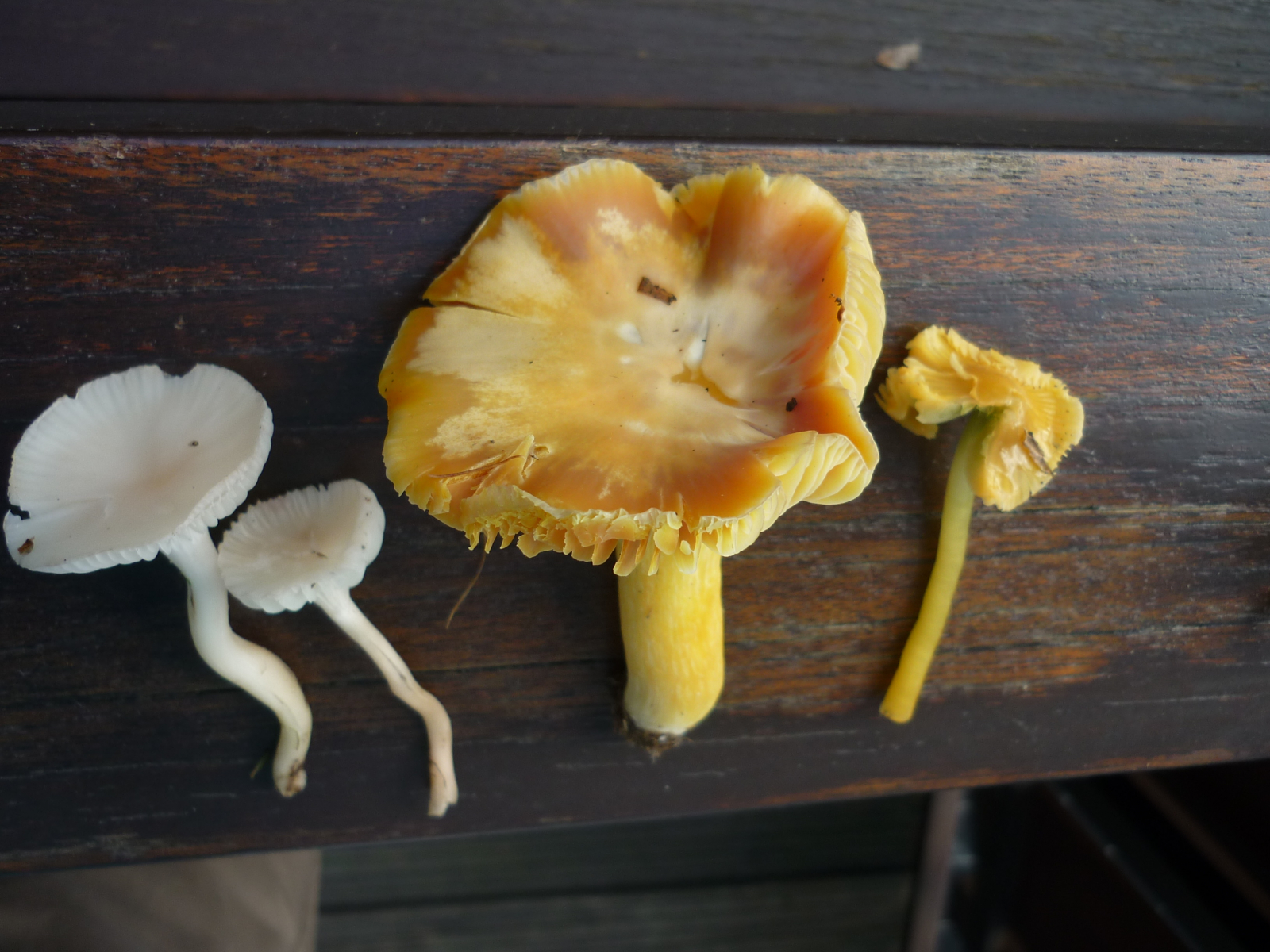 • So jetzt noch ein paar Fotos: vom Großen Saftlings-Schlachtfest und von einem orange gefärbten Saftling, den ich gestern fand. Den halte ich für den Mennigroten Saftling: Geruch neutral und Geschmack mild, Huthaut feinfilzig Und dann zwei Ellerlinge, die ich für Jungfern-Ellerlinge halte.