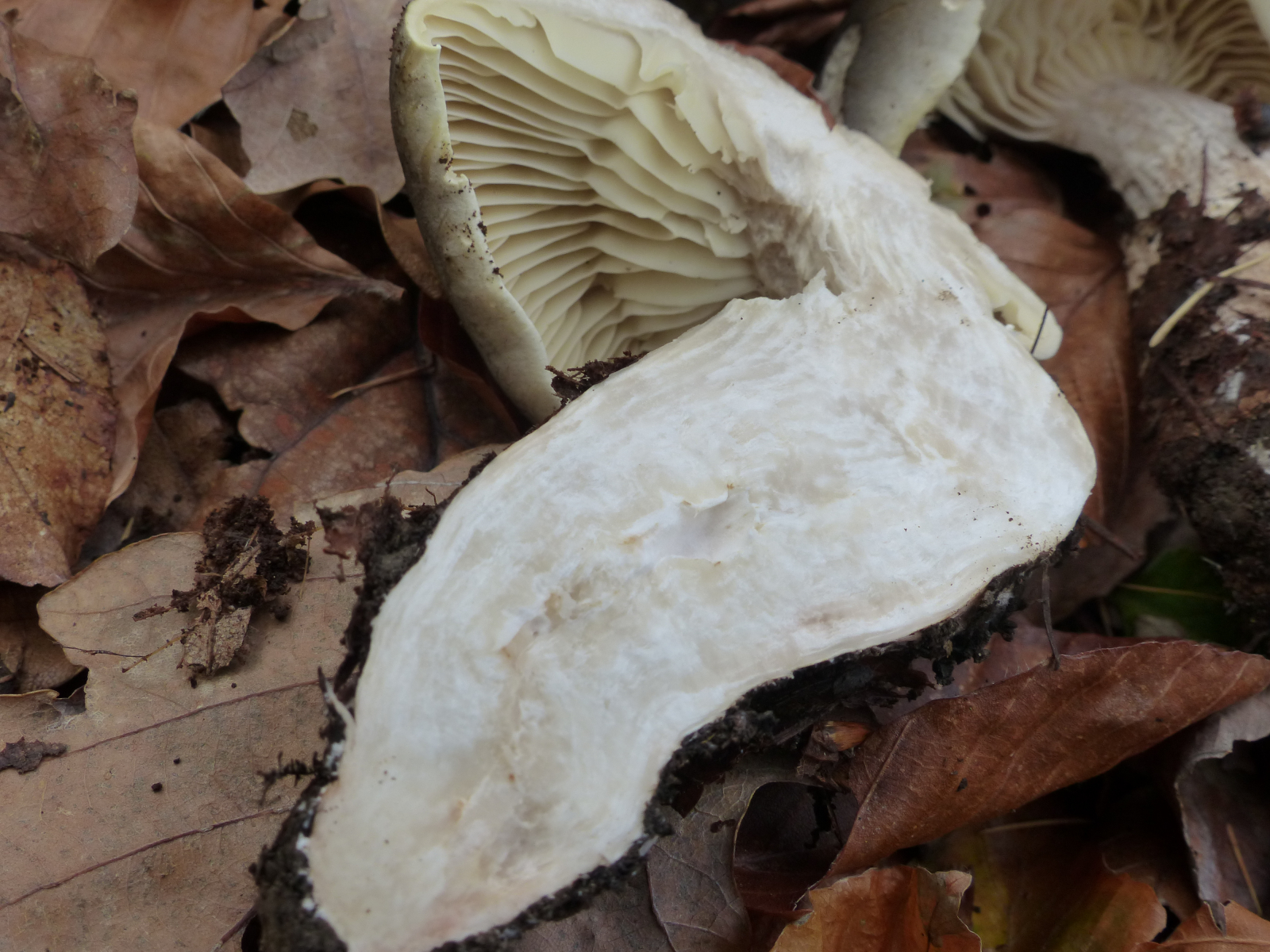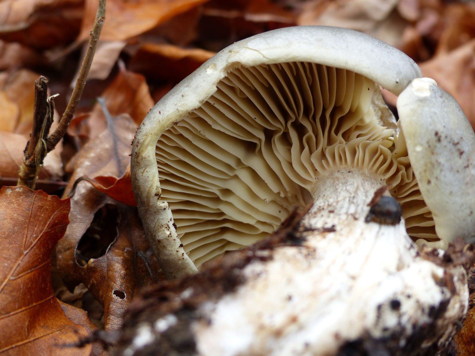 Lamellen: cremefarben, mit Gelbgrünstich, angewachsen, Zwischenlamellen unterschiedlicher Länge,