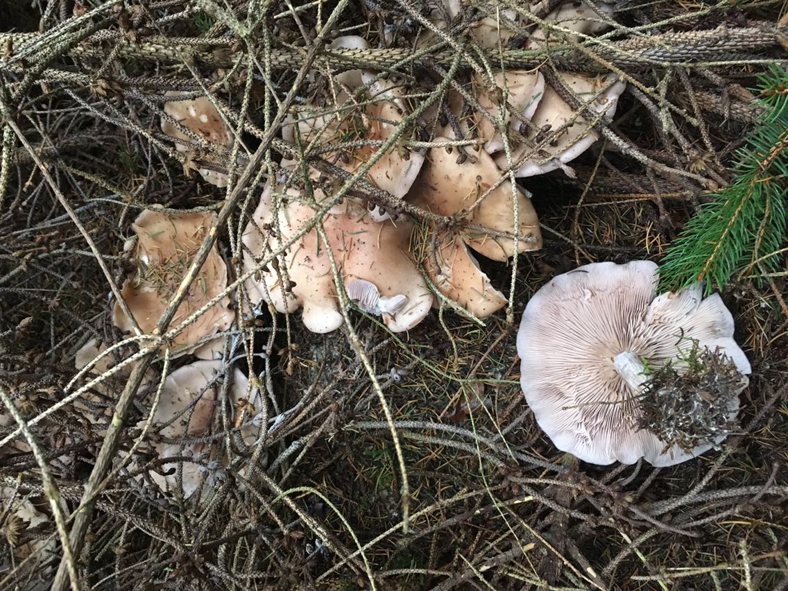 Direkt neben diesen in 50cm Entfernung war eine riesige Gruppe ähnlicher Pilze . Diese aber schon eher alt . Die Pilze waren unter einem Haufen FichtenGezweig..