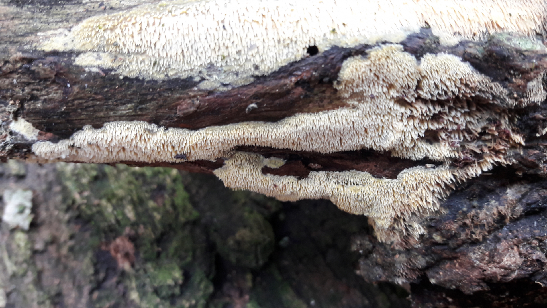 im Moos an liegender Buche (habe zuerst gedacht der Pilz wächst so gezahnt/dürfte aber nur das Moos überwachsen haben)