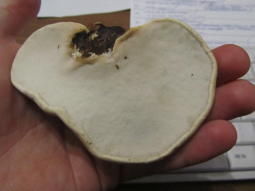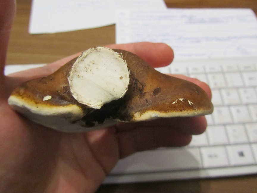 Der Birkenporling wuchs wie zu erwarten auf einem abgebrochenen Birkenast, ist absolut weiß innen und wunderbar gut erhalten. Ich weiß nur noch nicht, ob ich ihn auf der Heizung oder besser bei 50 Grad im Ofen trockne.