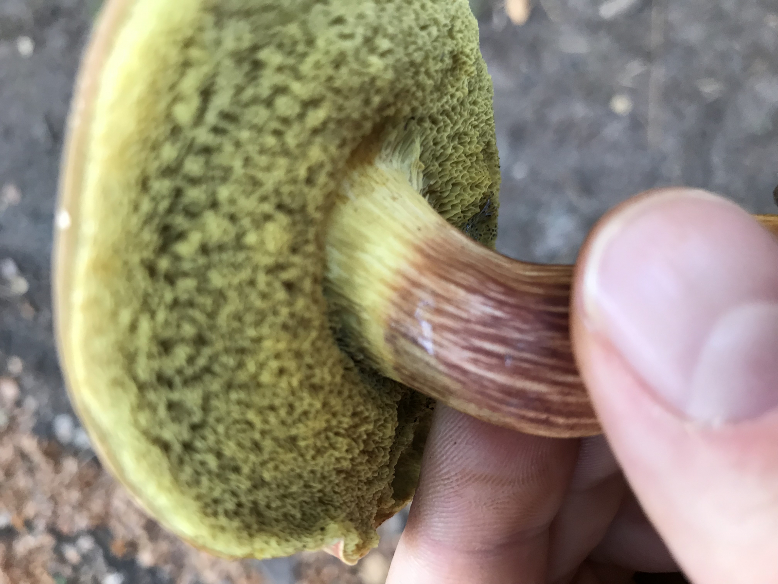 Ärgerlich dabei: Das ist dieser "Grenzgänger", der irgendwie schwer einzuordnen ist. Einzelexemplare sind in der Gattung immer schwierig, zu so einem späten Fundzeitpunkt umso mehr. Am ehesten sollte das >chrysenteron< sein, auch wenn die roten Fasern im Stielfleisch hier sehr schwach ausgeprägt sind. Aber bei pruinatus müsste die Stielrinde blauen, das Fleisch in Stiel und Hut deutlicher gelb sein (und ohne Rot im Stiel), für cisalpinus, porosporus etc. blaut der viel zu wenig (nämlich quasi gar nicht), für einen Hortiboletus passen die Fleischfarben im Stiel auch nicht (vor allem Stielbasis, selbst für eine der Arten ohne Pünktchen).