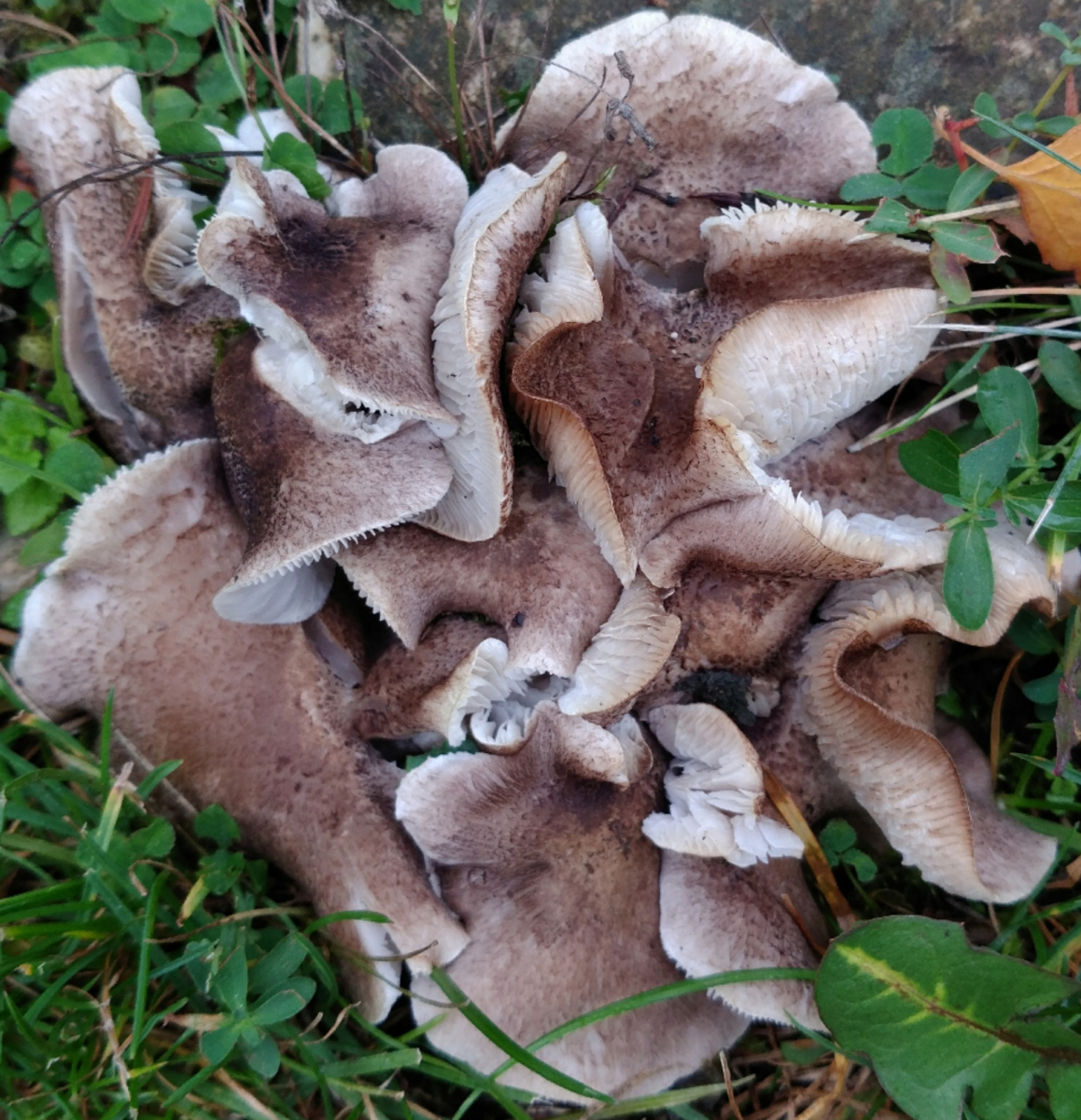 Dazu müsstest du - um näher an die Bestimmung ranzukommen, auch mal einen oder zwei Frucktkörper komplett aus dem Boden nehmen (vorsichtig heraushebeln, am besten so, daß auch noch ein paar der Mycelfäden an der Stielbasis dabei sind). Damit man die Stieloberflächen und eventuelle Verfärbungen an der Stielbasis noch beurteilen kann. einen der Fruchtkörper solltest du dann mal eine Nacht liegen lassen (nicht zu warm, sonst wird er flüssig), weil die Verfärbungen bei solchen Ritterlingen oft sehr langsam vonstatten gehen (ähnlich wie zB beim Perlpilz).