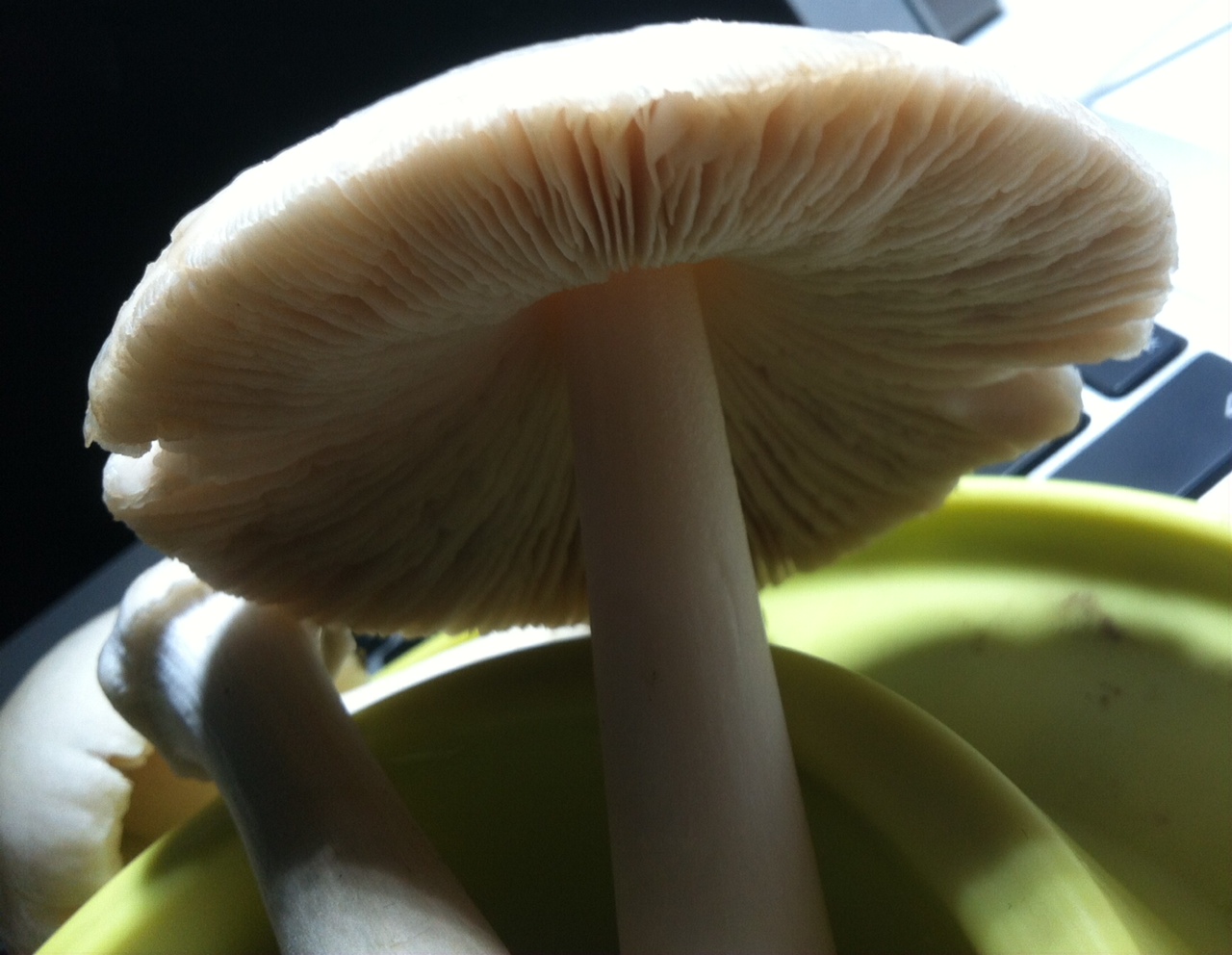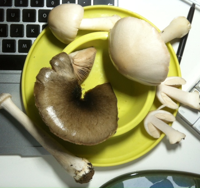 Beim Fund trocken waren sie beim Pflücken : drei 'Hut Weiss / Lamellem weiss leicht duftend, Geruch vllt. 'erdig' und weiß mit zartgelblichem Scheitel, der inzwischen leicht braungräulich ist. Anschnitt nicht gilbend, Stiele fest : Gesamtbild : bis auf die schmierigen Hutoberflächen, insgesamt angenehm.
