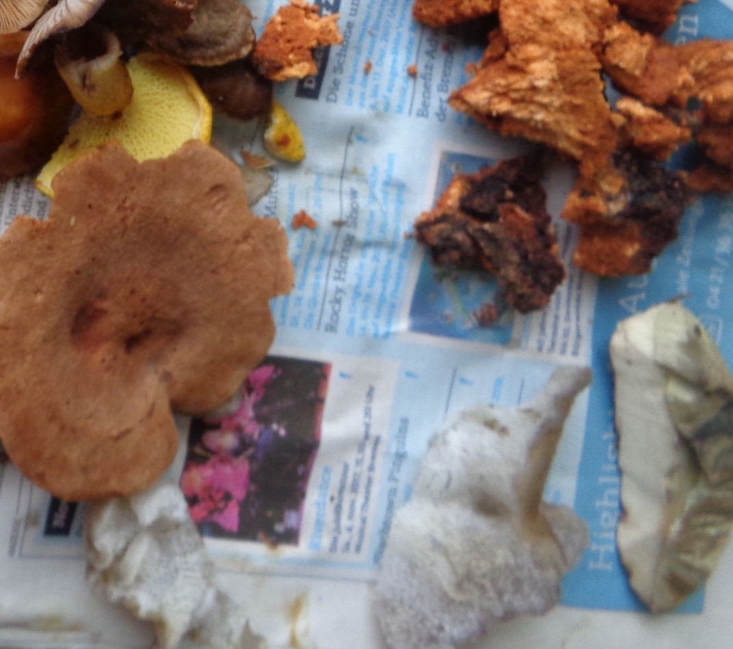 Fund vom 9.11.17: Marone (unten re. und Hohlfussröhrling oben links), übrigen Pilze auf dem Foto (Eisspilz/Zitterling, Bruchreizker/Maggipilz, Chaga???) habe ich nicht verwendet.