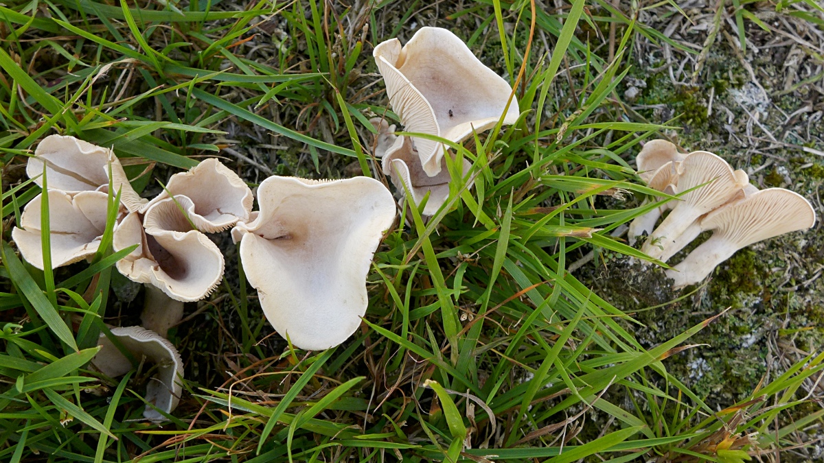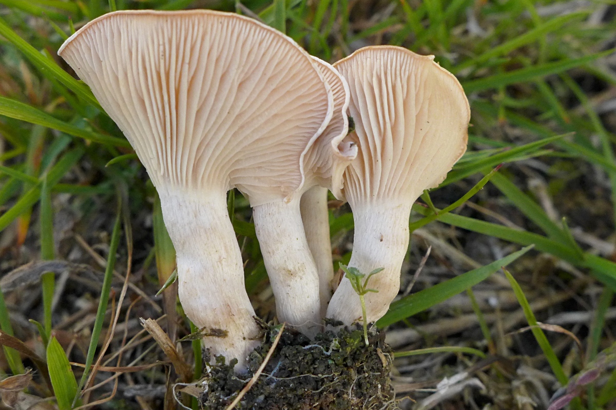 auf Kalk (eigentlich), im Zwischenbereich von schotterig-sandigem Boden (Planierter Platz, magerer Bewuchs, Pilze dort z.B. Bleigrauer Zwergbovist, Bovista plumbea) und einem Streifen von Grünfläche mit Gras, das erst kürzlich so bewachsen ist /Wildwuchs -nicht angelegt, weil man einen Teich in der Fläche verringert hat - also ursprünglich ein Teichuferbereich (Pilze dort z.B. ein winziger - 1cm im Hutdurchmesser - Schwärzender Saftling, Hygrocabe conica s.l. und einige Dunkle Rasenrötlinge, Entoloma sericeum),