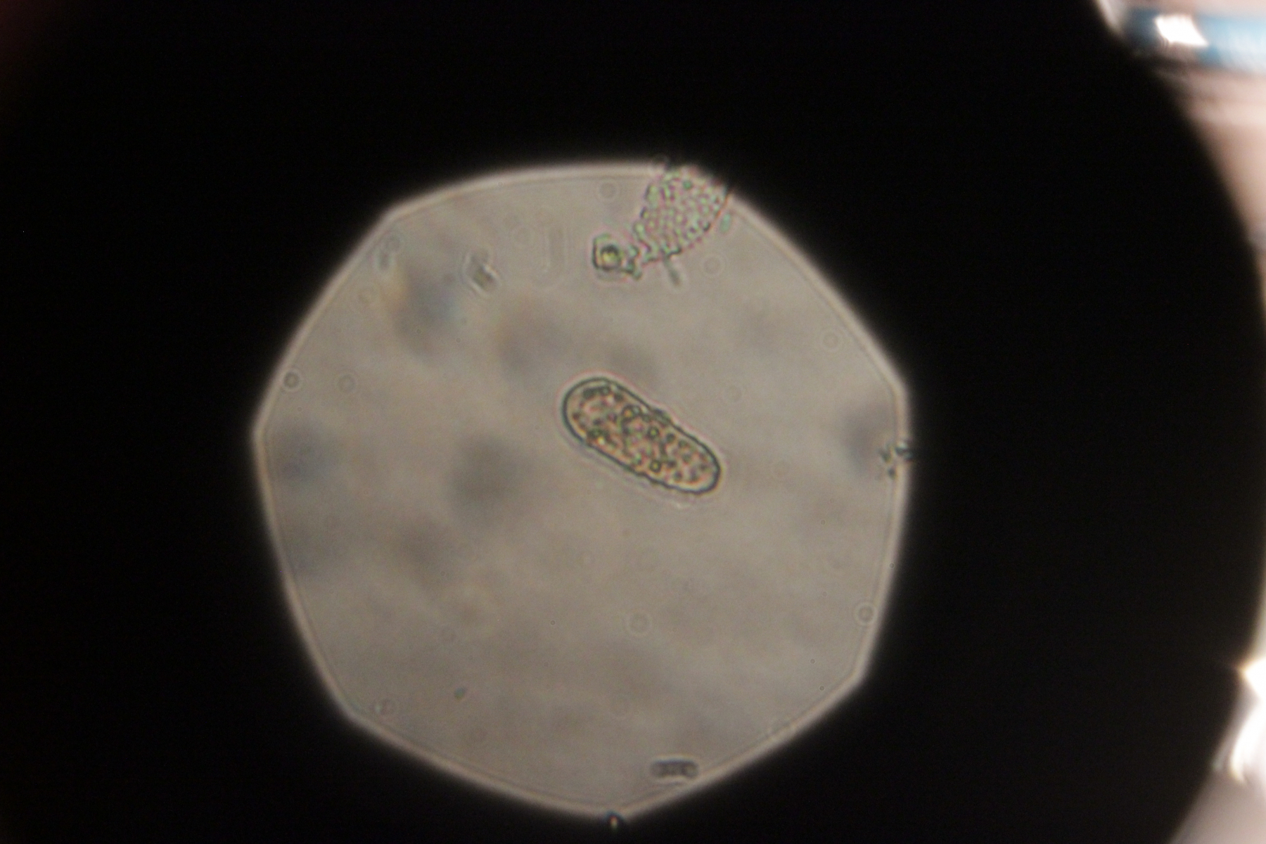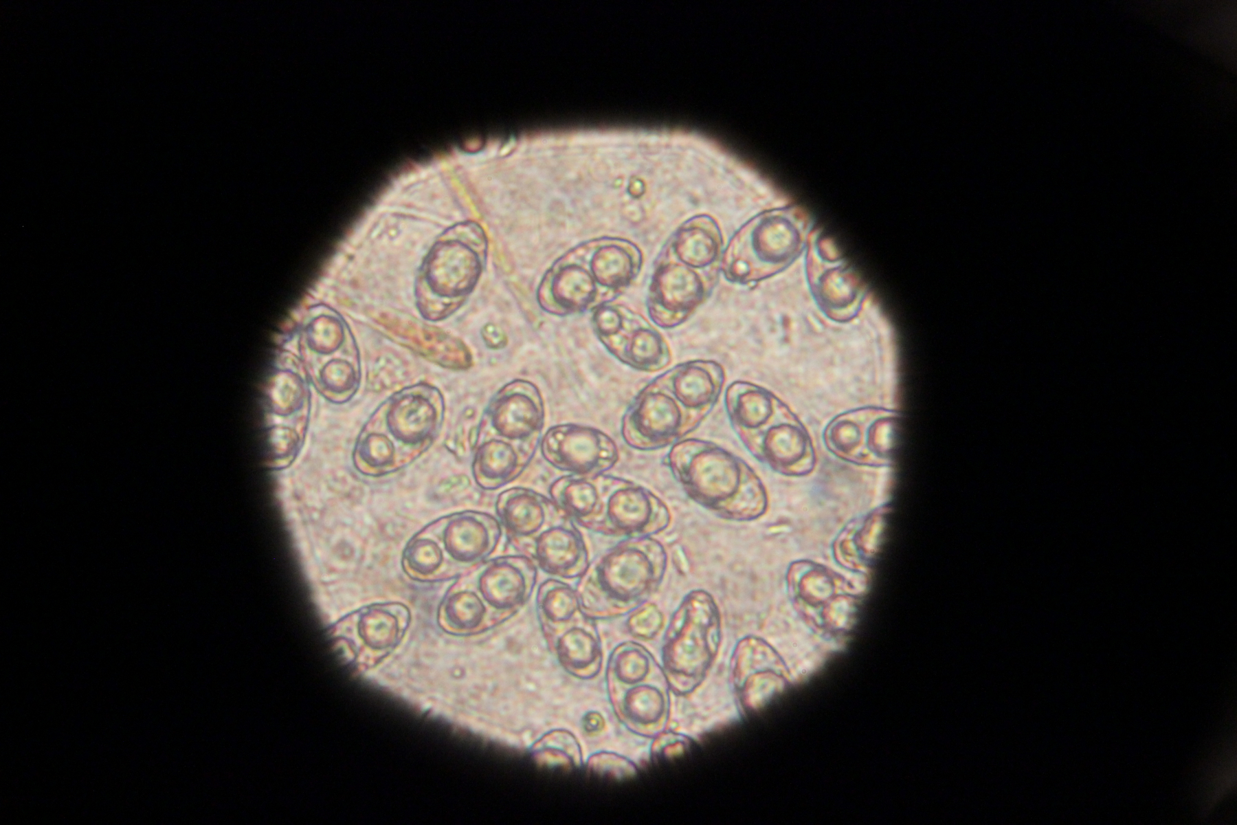 • 1. Eigentlich wollte ich mir den Pilz ja gestern Abend genauer anschauen. Leider hat er die Nacht bei mir nur sehr schlecht überstanden: Viel mehr als ein kleiner brauner Fleck ist nicht übrig geblieben. Die sterblichen Überreste habe ich dann aber trotzdem mal unters Mikroskop gelegt, wobei dann das rauskam (meine Mikroskopierkünste sind ja generell noch in den Kinderschuhen und wenn der Pilz sich dann nicht kooperativ zeigt, wird es nicht einfacher...):