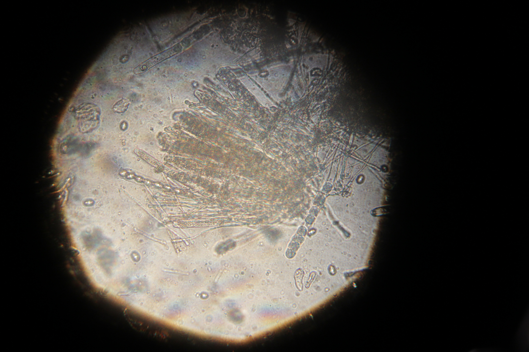 1. Eigentlich wollte ich mir den Pilz ja gestern Abend genauer anschauen. Leider hat er die Nacht bei mir nur sehr schlecht überstanden: Viel mehr als ein kleiner brauner Fleck ist nicht übrig geblieben. Die sterblichen Überreste habe ich dann aber trotzdem mal unters Mikroskop gelegt, wobei dann das rauskam (meine Mikroskopierkünste sind ja generell noch in den Kinderschuhen und wenn der Pilz sich dann nicht kooperativ zeigt, wird es nicht einfacher...):