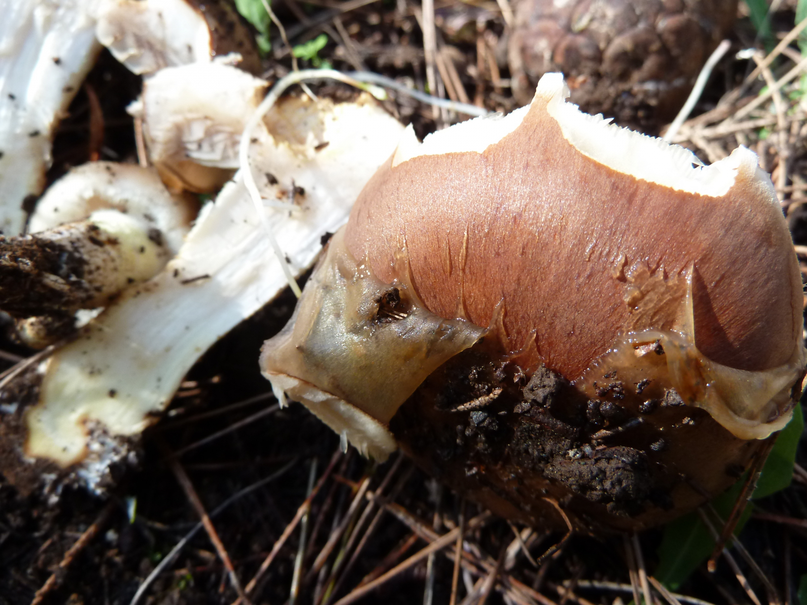 Trotz etwa vierstündiger Suche konnte nur einige Pilzarten finden, von denen ich hier diese recht hellblättrige Cortinarie vorstellen möchte. Die Problematik der Bestimmung von Cortinarien ist mir mittlerweile bekannt, vielleicht ergibt sich trotzdem aufgrund der Fotos die Möglichkeit der Bestimmung oder Eingrenzung. Auffällig finde ich die abziehbare Schleimschicht auf dem Hut (so wie beim Butterpilz oder Kuhmaul) und die ziemlich hellen Lamellen.