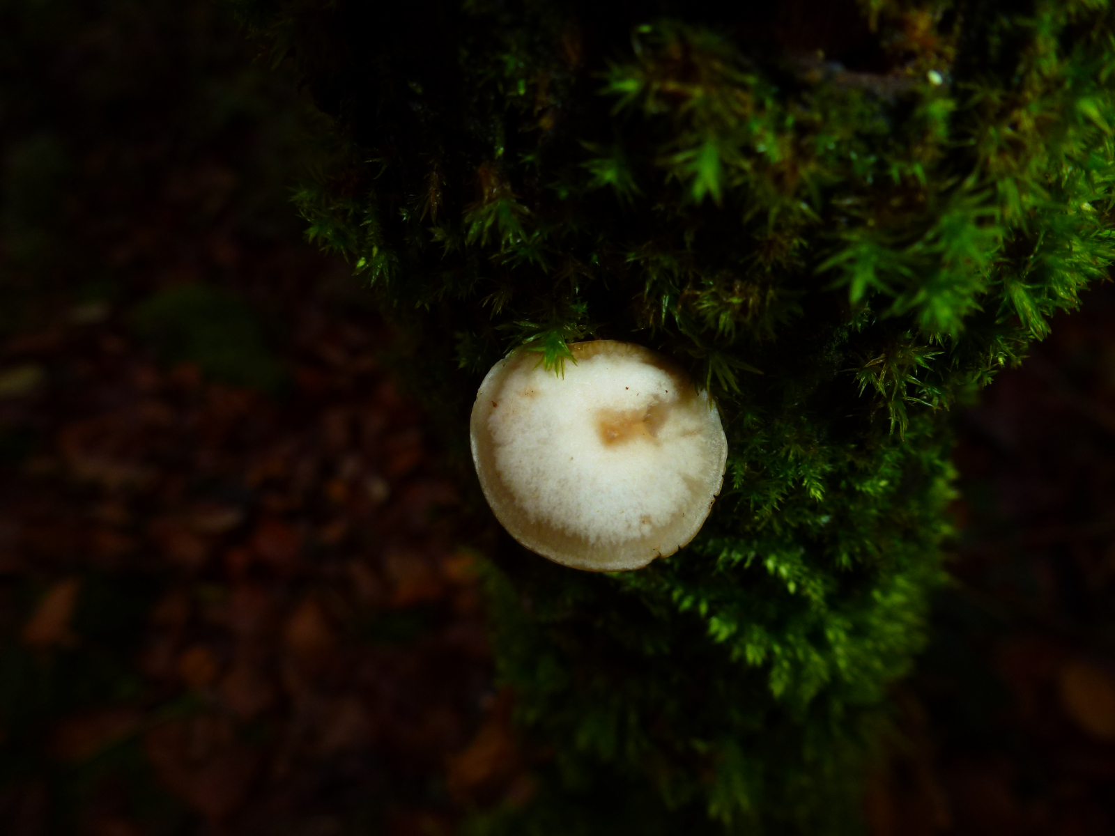 das könnte eventuell einer der weißlich bereiften ("komische" Oberfläche) giftigen kleinen Trichterlinge sein, der hier im Moos wächst (Moos auf dem Holz, Pilz nicht direkt auf dem Holz wahrscheinlich).