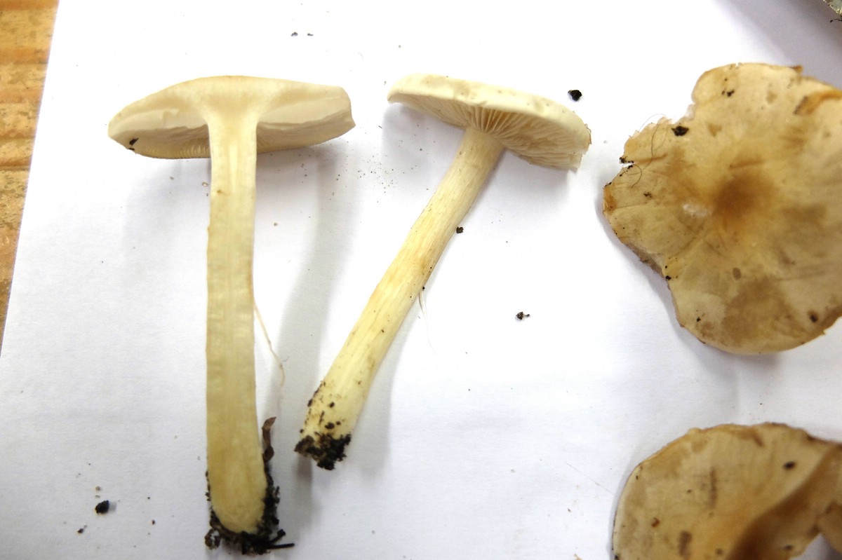 Da bin ich auch unsicher, ob's nicht zwei Arten sind. Vielleicht sollte man den Fruchtkörper mit dem dunklen, irgendwie durchwässerten fleisch mal beiseite tun und ignorieren, dann gehört der andere wohl schon in den Formenkreis um Hebeloma crustiliniforme (Tonblasser Fälbling).