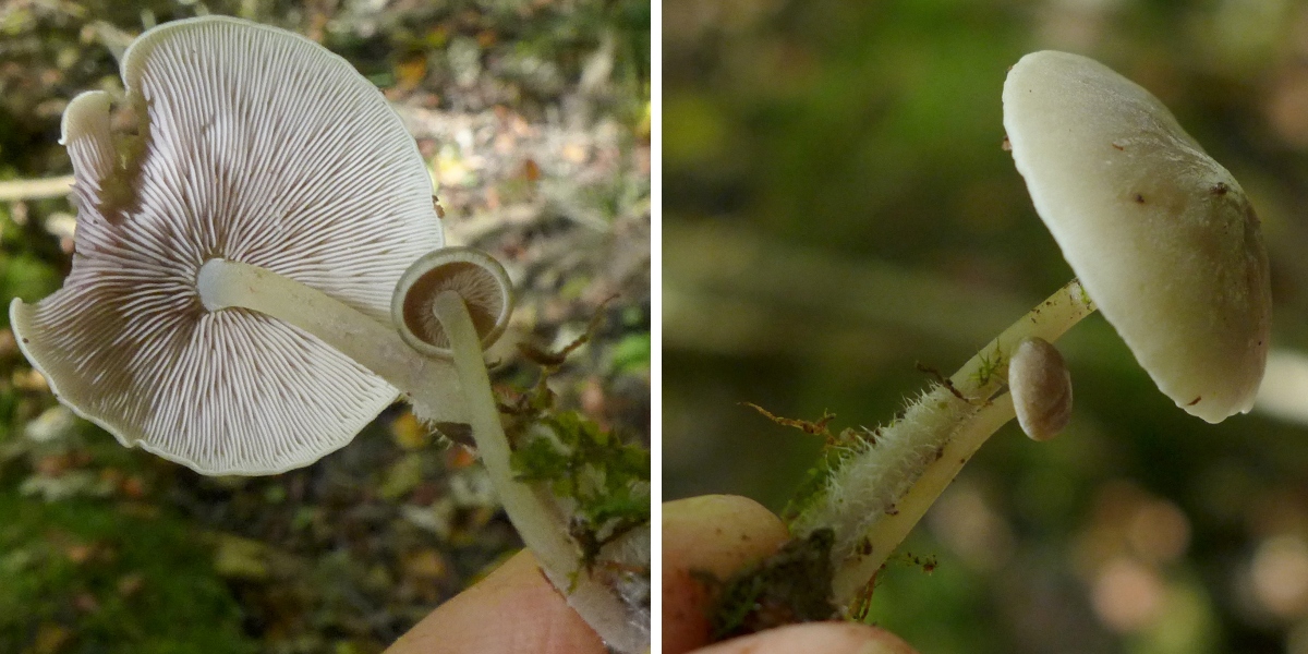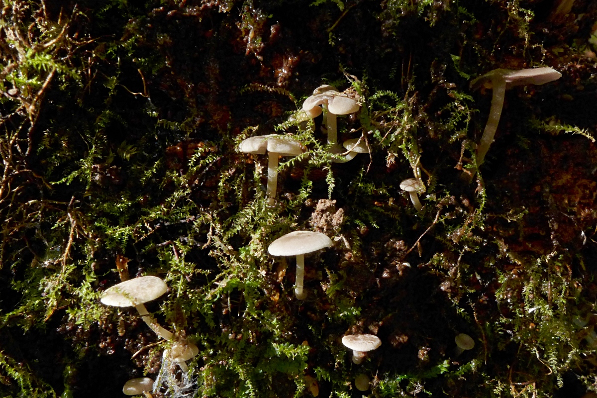 Auf einem sehr bemoosten, sehr morschen Nadelholzstamm (an Astresten erkennbar) wuchsen winzige rüblingsartige Pilzchen, die beim Umdrehen vor allem durch ihre extrem dichten Lamellen auffielen.