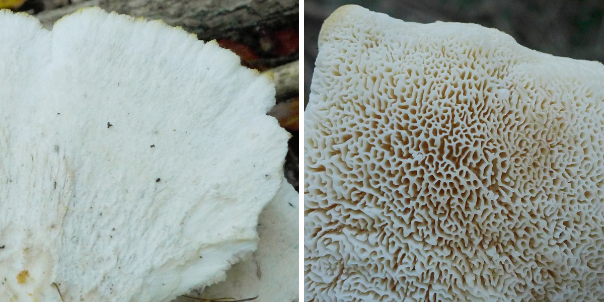 Von unten (und mit angenehmen Geruch) : Nordischer Schwammporling, Climacocystis borealis (pers. Zweitfund, Erstfund war völlig zernagt)