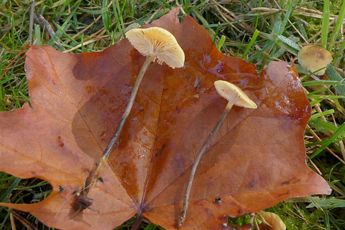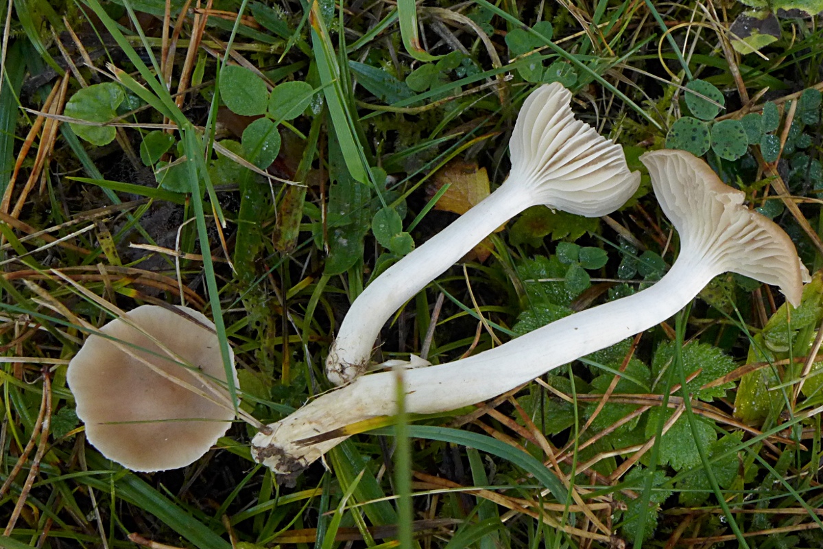 Am gleichen Ort, immer wieder auf der Wiese, kleine Jungfern-Ellerlinge, immer leicht bräunlich, laufen die alle unter Cuphophyllus virgineus ... oder sollte man unterscheiden, wg. der Farbe ... Cuphophyllus ochraceopallidus ?)