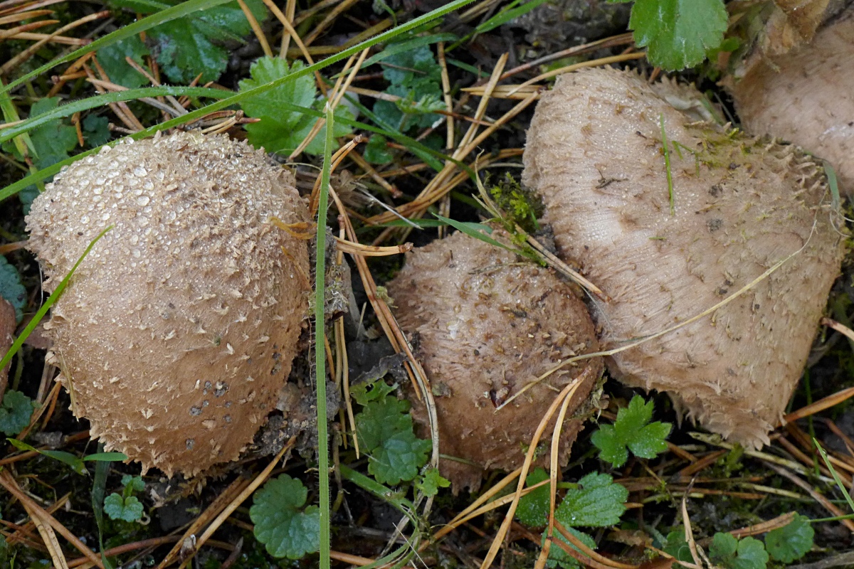 Am gleichen Ort, zwischen Fußtrittplatten und Grabbewuchs, Kakaobraune Stachelschirmlinge, Lepiota calcicola