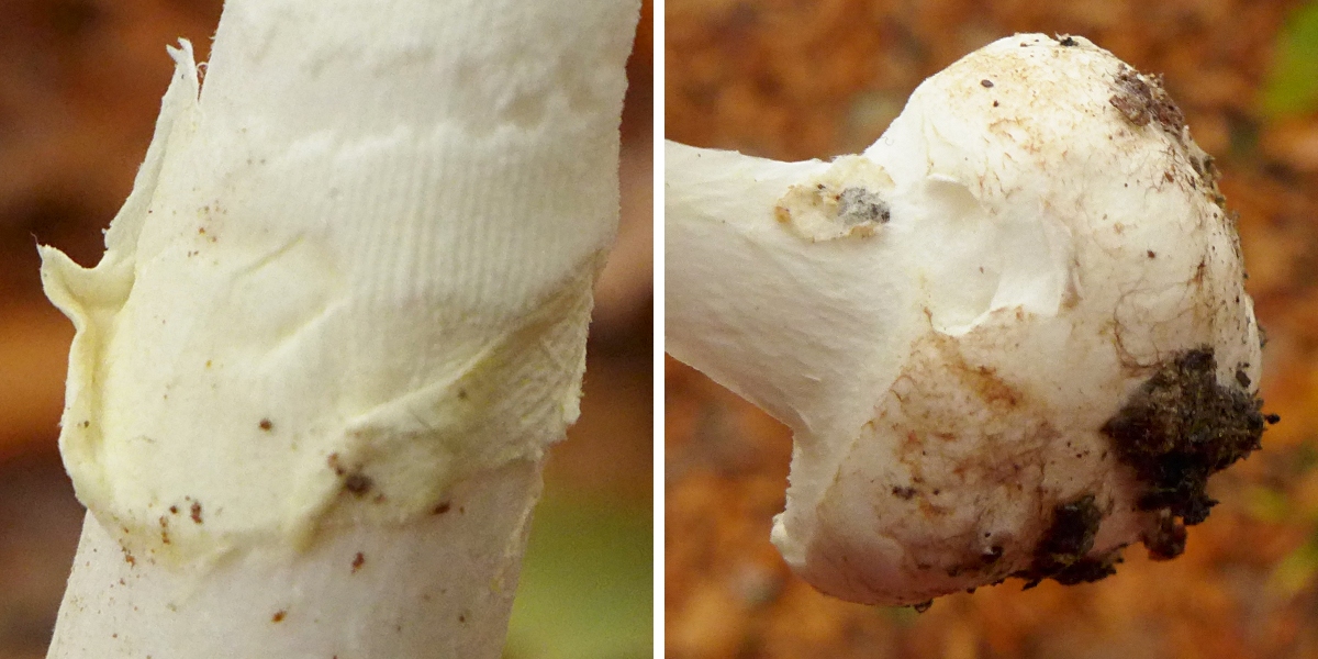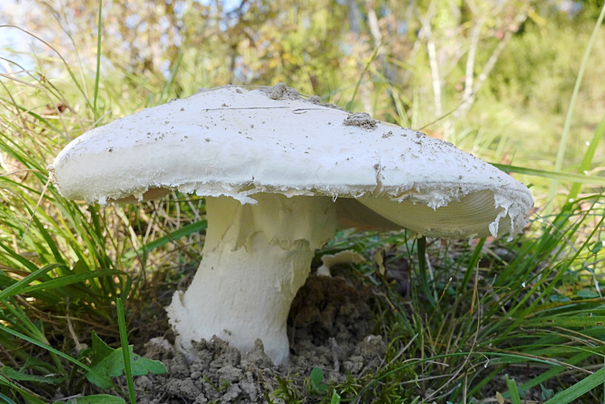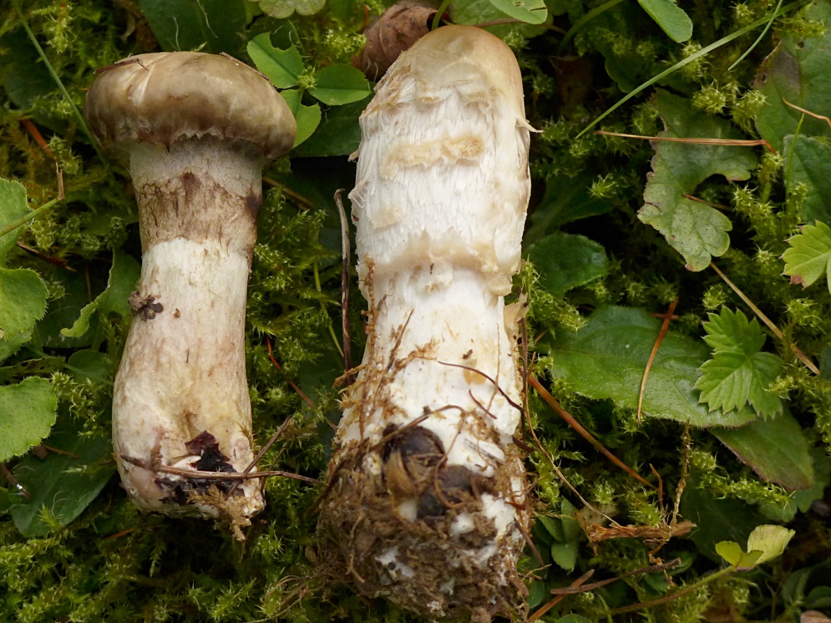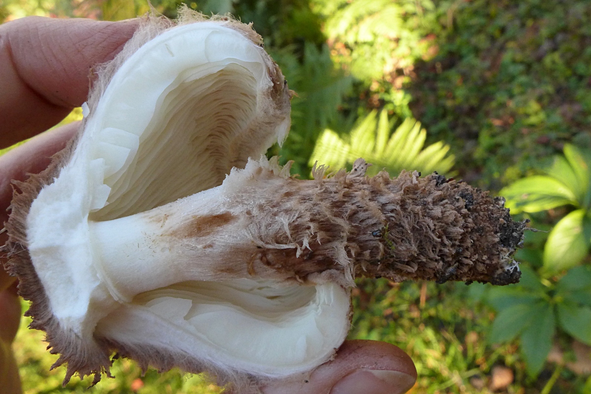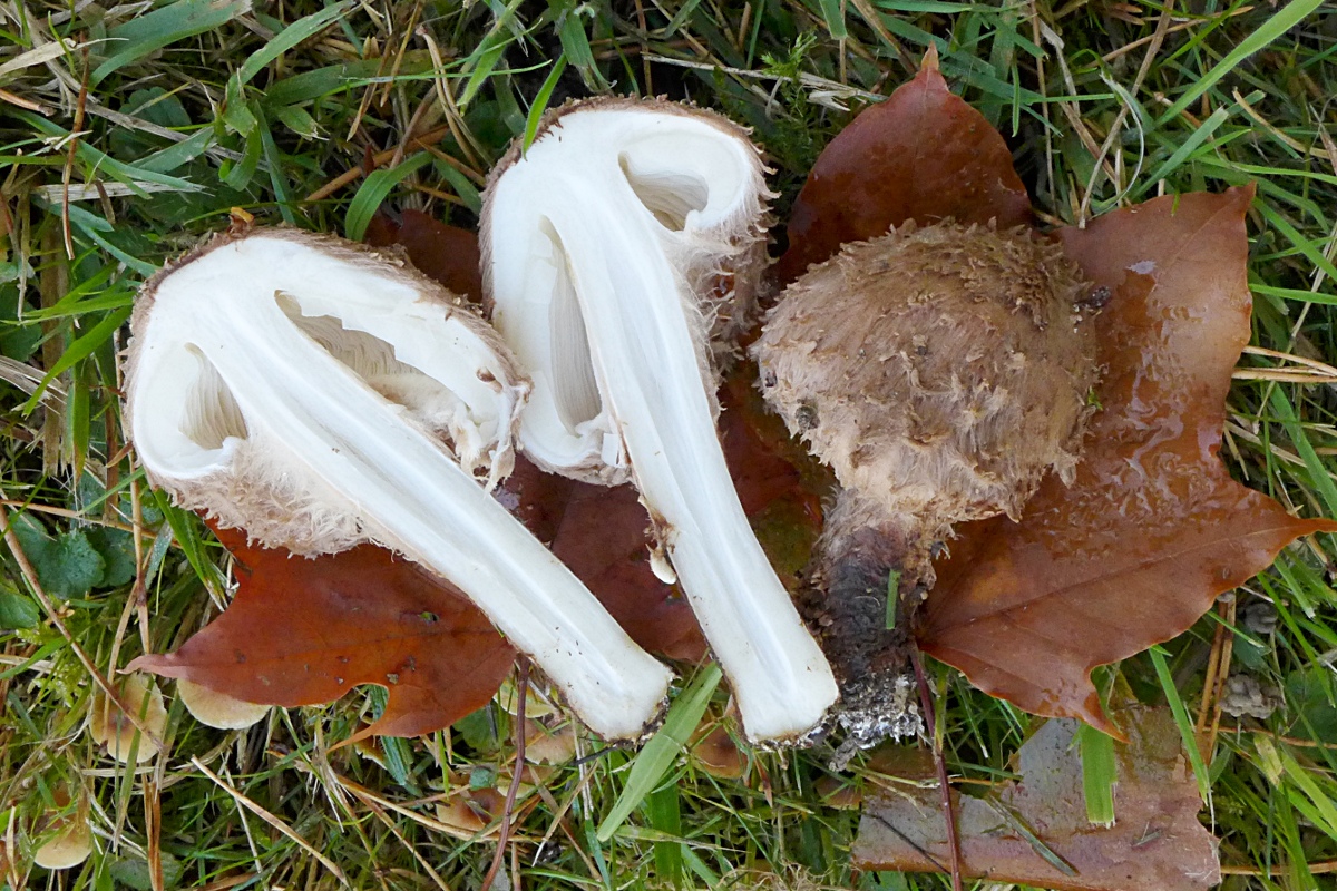 Am gleichen Ort, neue Stelle im Vergleich zum letzten Jahr, zum ersten Mal ein voll aufgeschirmter (über 20 cm) Fransiger Wulstling, Amanita strobiliformis