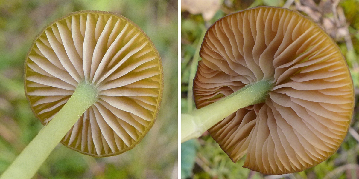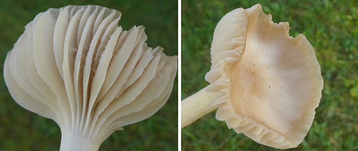 Die Pilze erscheinen sehr hell, im feuchten Zustand auch durchscheinend, im trockenen Zustand entwickeln einige Pilze radiale bräunliche Fasern, sie haben extrem ausgebuchtet angewachsene Lamellen.