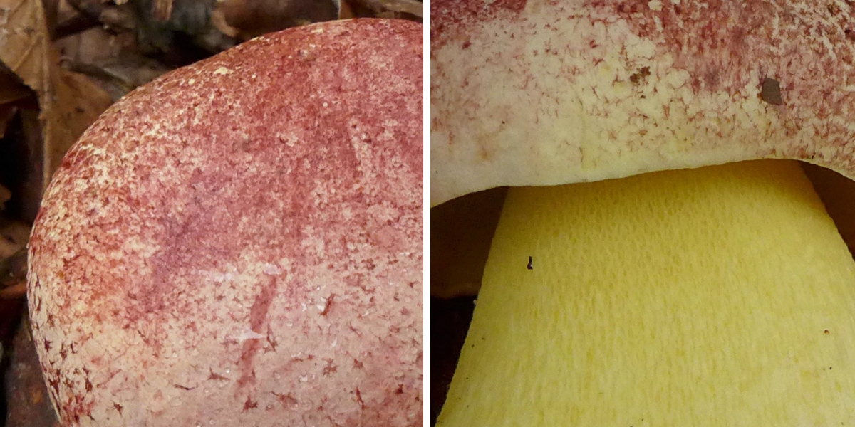 Faserflockiger, irgendwie von Weitem körnig erscheinender roter Hut, intensiv gelber Stiel mit gelbem Netz, intensiv gelbe Röhren und Poren, gelbes Fleisch (soll nicht blauen, jedenfalls nicht deutlich, im Schnitt gab es im Hut eine winzige schwache Blaufärbung an wenigen Stellen), Geruch sehr neutral.
