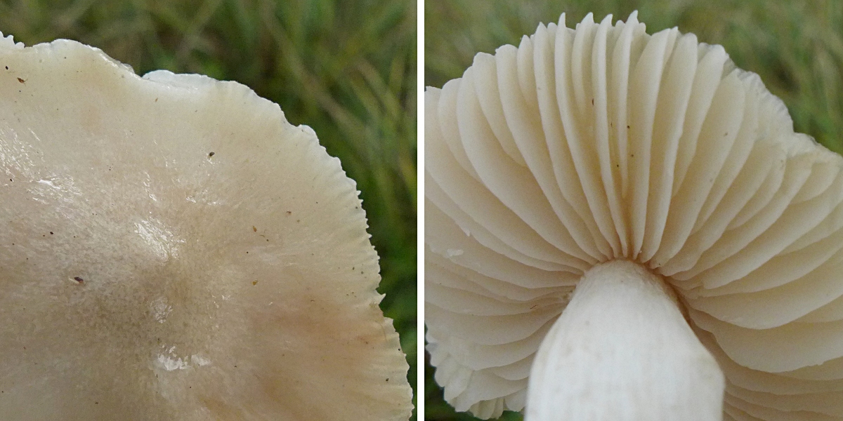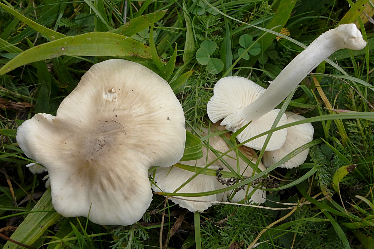 Kraftwerkswiese am Rhein, weiße Saftlinge (die hatte ich 2014 schon mal, jetzt habe ich mir den übersetzten Schlüssel aus dem Boertmann dazu angesehen) - da gibt es doch gar keine Alternative zum Blassrandigen Saftling, Hygrocybe fornicata, oder?