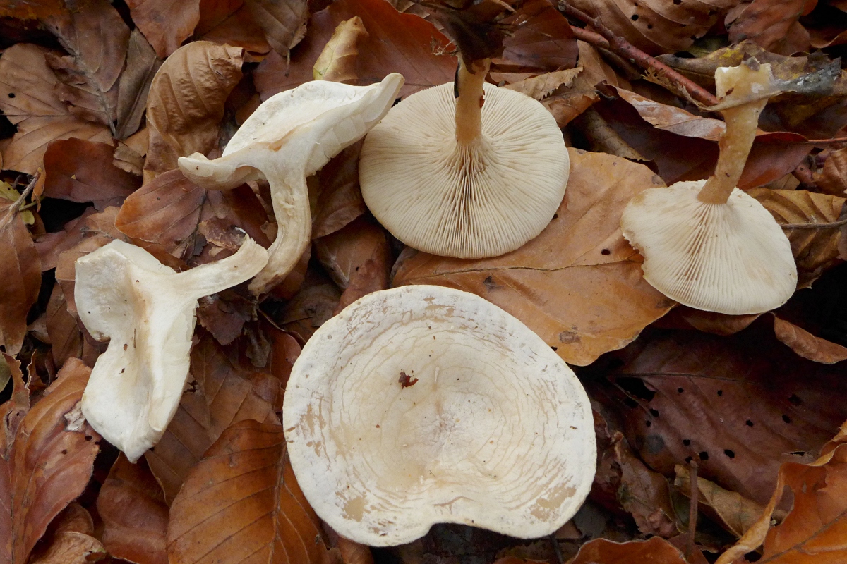 Nicht weit davon, bei Buchen auf Kalk, eine große Gruppe von älteren weißen bereiften kräftig gebauten langstieligen Trichterlingen, aus der Sektion Candicantes, vermutlich die (nicht abgegrenzte) Laubwaldform von Clitocybe phyllophila, Laubfreund-Trichterling.