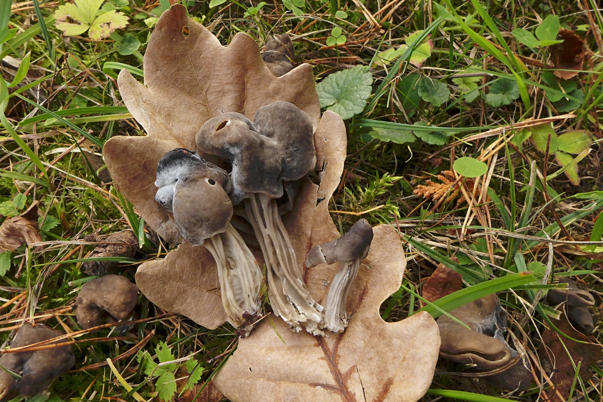 nicht weit davon, unter dicker Eichenlaubschicht, da lugten so Spitzen hervor, dunkle Lorcheln mit grubigem Stiel ... es waren Grubenlorcheln, Helvella lacunosa (pers. Erstfund :sun: )